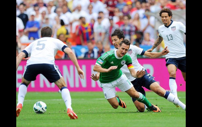 Deportes | El cuadro americano festeja 100 años de su federación pero deja dudas a pesar de ganar EU vence 4-3 a Alemania El cuadro americano festeja 100 años de su federación pero deja dudas a pesar de ganar Por: EFE 2 de junio de 2013 - 16:09 hs Miroslav Klose recibe una falta en el juego de Alemania ante Estados Unidos. EFE / WASHINGTON, D.C. (02/JUN/2013).- El centrocampista Clint Dempsey marcó dos de los cuatro goles con los que la selección de Estados Unidos venció por 4-3 a la de Alemania en partido amistoso de celebración del Centenario de la fundación de la Federación de Futbol del equipo de las barras y las estrellas. Estados Unidos, que cayó por 4-2 el miércoles en amistoso con Bélgica, esta vez fue un equipo completamente diferente y además con mejor condición física que Alemania, que nunca se adaptó al fuerte calor y a la humedad que se registró en el RFK Stadium, de Washington. La gran figura del partido fue Dempsey, el nuevo capitán de Estados Unidos, que con sus dos goles llegó a seis en lo que va del año y a 35 desde que juega con la selección, lo que lo pone como el segundo máximo anotador en la historia de la selección, sólo superado por Landon Donovan. El partido no pudo comenzar mejor para Estados Unidos que al minuto 14 elaboró un buen contraataque dirigido por el centrocampista Graham Zusi que puso un balón perfecto dentro del área para que Jozy Altidore sobre la marcha rematase con la derecha y batiese al arquero alemán Marc-André ter Stegen. El 2-0 llegó al minuto 17 como regalo del propio Stegen que dejó pasar el balón de forma incomprensible cuando su compañero, el defensa Benedikt Howedes, se lo había cedido sin ningún peligro. A partir de ese momento, Alemania intentó despertar, pero el fuerte calor y la humedad no favoreció que sus acciones tuviesen la velocidad suficiente para sorprender a la bien posicionada defensa de Estados Unidos, que se fue al descanso con la ventaja de 2-0. Pero en la segunda parte, Alemania, que salió con cuatro cambios que hizo el seleccionador Joachim Low, comenzó a hacer su mejor fútbol y al minuto 52 el defensa central Heiko Westermann marcó de cabeza el 2-1. Pero la reacción de Alemania duró poco porque surgió la inspiración goleadora de Dempsey, que a los 60 y 64 anotó los goles que aseguraron el triunfo de Estados Unidos en la celebración del Centenario del nacimiento del fútbol como deporte oficial en este país, en 1913. Alemania intentó conseguir el empate y estuvo cerca de lograrlo después que Max Kruse marcó el 4-2, a los 79 minutos, para que Julian Draxler, al 81, lograse con potente disparo desde fuera del área poner el definitivo 4-3. El triunfo permitió a Estados Unidos seguir con marca ganadora de 14-3-5 en los partidos oficiales que ha disputado en toda su historia en el RFK Stadium, de Washington. El próximo compromiso de Estados Unidos será el partido del hexagonal de la Concacaf del Mundial de Brasil 2014 que disputará el viernes, en el National Stadium; de Kingston, frente a Jamaica. Luego, el 11 de junio seguirá con las eliminatorias mundialistas cuando se enfrente a Panamá, en CenturyLink Field, de Seattle, y el 18 lo hará ante Honduras en el Rio Tinto Stadium, de Sandy (Utah). Alemania, por su parte, regresa a Europa sin ningún tipo de compromiso cercano tras cumplir una gira de dos amistosos en Estados Unidos, el primero disputado ante Ecuador y que ganó por 4-2. - Ficha técnica: 4. Estados Unidos: Tim Howard; Fabian Johnson (m.46, Brad Davis), Omar González, Matt Besler, DaMarcus Beasley (m.57, Edgar Castillo); Jermaine Jones, Michael Bradley, Graham Zusi (m.56, Eddie Johnson), Brad Evans; Clint Dempsey y Jozy Altidore (m.81, Terrance Boyd). Seleccionador: Jurgen Klinsmann. 3. Alemania: Marc-André ter Stegen; Benedikt Howedes, Per Mertesacker (m.46, Philipp Wollcheid), Lars Bender (m.46, Heiko Westermann), Marcell Jansen (m.46, Dennis Aogo); Sven Bender (m.46, Max Kruse), Julian Draxler, Andre Schürrle (m.68, Sidney Sam), Stefan Reinartz; Lukas Podolski y Miroslav Klose (m.80, Nicolai Müller). Seleccionador: Joachim Low. Goles: 1-0, m.14: Jozy Altidore. 2-0, m.17: Marc-Andre ter Stegen, en propia meta. 2-1, m.52: Heiko Westermann. 3-1, m.60: Clint Dempsey. 4-1, m.64: Clint Dempsey. 4-2, m.79: Max Kruse. 4-3, m.81: Julian Draxler. Árbitro: el mexicano Paul Delgadillo, no mostró tarjetas. Incidencias: Partido amistoso para celebrar el Centenario de la Federación de Fútbol de Estados Unidos disputado en el RFK Stadium, de Washington, ante 47 mil 359 espectadores. Temas Futbol Internacional Partidos amistosos Selección de Estados Unidos Selección de Alemania Lee También ¿Dónde ver EN VIVO el partido de J14 Pachuca vs Tigres? A punto de aparecer el ciclón "Melissa"; a esta distancia está de México Tormenta tropical podría formarse en este punto del Pacífico mexicano ¿Dónde ver EN VIVO los juegos de la Semana 8 de la NFL? Recibe las últimas noticias en tu e-mail Todo lo que necesitas saber para comenzar tu día Registrarse implica aceptar los Términos y Condiciones