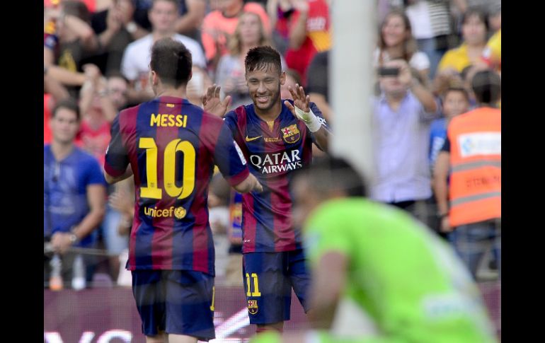 Deportes | Triplete de Neymar y doblete de Messi dan triunfo al Barça El Barcelona golea a Granada y es líder Triplete de Neymar y doblete de Messi dan triunfo al Barça Por: AFP 27 de septiembre de 2014 - 12:40 hs El conjunto catalán lleva 17 goles en seis jornadas y no ha recibido ninguno. AFP / J. Lago MADRID, ESPAÑA (27/SEP/2014).- El Barcelona recuperó el liderato al golear este sábado al Granada (8º) por 6-0, con un triplete del brasileño Neymar, un doblete del argentino Leo Messi y un tanto del croata Ivan Rakitic, en la sexta jornada de la liga española. Con este triunfo, el Barcelona quita el primer puesto al Valencia, que juega el domingo en campo de la Real Sociedad, que se queda a tres puntos y que solo podría recuperar el liderato marcando seis goles o más al equipo vasco. El conjunto catalán llegó con una ventaja de 3-0 al descanso, con los tantos dos tantos de Neymar (26 y 45) y uno de Rakitic (43). En la segunda mitad, Messi (62 y 82) y Neymar (66) completaron la goleada. El brasileño, con seis goles, y el argentino, con cinco, reducen diferencias respecto al líder de la tabla de realizadores, el portugués Cristiano Ronaldo, que marcó su décimo tanto este sábado en la victoria del Real Madrid en campo del Villarreal (2-0). El Barcelona lleva 17 goles anotados en seis jornadas y no ha recibido ninguno. Temas Futbol Español Futbol Internacional Barcelona Lionel Messi Neymar Recibe las últimas noticias en tu e-mail Todo lo que necesitas saber para comenzar tu día Registrarse implica aceptar los Términos y Condiciones