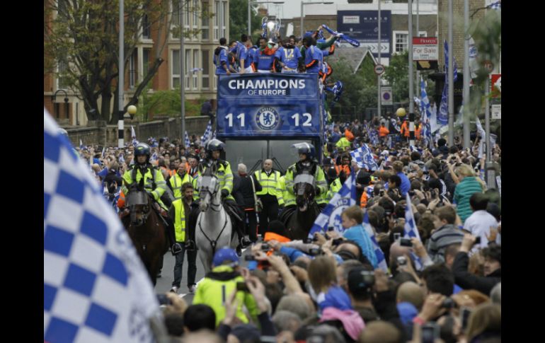 Deportes | El equipo celebra con miles de aficionados el haber ganado su primera 'Orejona' El Chelsea 'pinta' a Londres de azul El equipo celebra en las calles londinenses con miles de aficionados el haber ganado su primera 'Orejona' Por: NTX 20 de mayo de 2012 - 10:17 hs La plantilla completa de los 'Blues' realizó un desfile triunfal en autobús ante miles de seguidores en Londres. AP / LONDRES, INGLATERRA (20/MAY/2012).- La plantilla al completo del Chelsea celebró hoy con un desfile triunfal en autobús ante miles de hinchas en el oeste de Londres su primera Liga de Campeones, lograda en la tanda de penaltis de la final ante el Bayern de Munich. Sonrientes, vestidos de azul y luciendo la flamante Copa de Europa se mostraron esta tarde los jugadores del equipo londinense al arrancar un paseo victorioso en la parte alta de un autobús -del mismo color del equipo y en el que se leía: "Campeones de Europa"- desde su estadio, Stamford Bridge. Con fuertes medidas de seguridad, las calles colindantes con el campo del Chelsea, situado al oeste de la capital británica, se abarrotaron de una multitud de seguidores -algunos de los cuales llevaban más de dos horas esperando- que hicieron ondear las banderas del club y vitorearon a sus campeones. Y es que el Chelsea logró anoche en la final disputada en Munich su primer título de "Champions" en su historia en una emocionante tanda de penaltis (3-4). Fue un encuentro en el que resultaron claves para el once británico, dirigido por el italiano Roberto Di Matteo, el punta marfileño Didier Drogba y el guardameta checo Petr Cech. Hoy los dominicales británicos destacaron la "dramática" victoria del conjunto londinense y subrayaron el papel desempeñado por el jugador de Costa de Marfil. Para el multimillonario dueño del club, el ruso Roman Abramovich, se trató de un sueño hecho realidad desde que compró el equipo hace nueve años. Temas Futbol Internacional Champions League Chelsea Recibe las últimas noticias en tu e-mail Todo lo que necesitas saber para comenzar tu día Registrarse implica aceptar los Términos y Condiciones