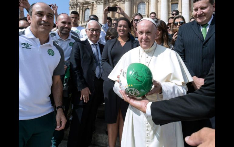 CIUDAD DEL VATICANO (30/AGO/2017).- El Papa Francisco bendijo este miércoles a una delegación de futbolistas, dirigentes y familiares pertenecientes al club de futbol brasileño Chapecoense, el mismo que protagonizó la tragedia aérea el 28 de noviembre de 2016.Al finalizar su audiencia general de los miércoles, ante miles de personas congregadas en la Plaza de San Pedro, el Papa se acercó a la comitiva compuesta por unas 80 personas entre las cuales se encontraban algunos familiares de los fallecidos en el accidente en las montañas de Colombia.El Pontífice bendijo algunas fotos y otros objetos que llevaban, también impartió su bendición y abrazó a algunos de los presentes. Recibió una pelota con los colores del equipo, el blanco y el verde; luego todos se tomaron una foto de grupo en las escalinatas de la Basílica de San Pedro.El equipo está en la capital italiana para disputar un partido amistoso con la Roma, en el estadio olímpico de esta ciudad el próximo viernes 1 de septiembre.Fueron 71 los muertos en el accidente del vuelo 2933 de LaMia, la compañía que debía conducir al equipo del Aeropuerto Internacional de Viru Viru en Bolivia al Aeropuerto Internacional José María Córdoba, en las inmediaciones de Medellín.Los jugadores y el cuerpo técnico se dirigían a jugar su primera final de la Copa Sudamericana frente al Atlético Nacional cuando, pasadas las 22:00 horas local, el avión que los transportaba se estrelló tras haberse quedado sin combustible.En recuerdo a la cifra de fallecidos, ya algunos meses atrás los directivos del club le entregaron al Papa Francisco una camiseta con el número 71 estampado en la espalda.