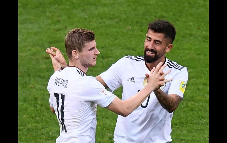 GUADALAJARA, JALISCO (25/jun/2017).- Quedó definido el rival para México en las semifinales de Copa Confederaciones. La Selección de Alemania enfentará el próximo jueves al Tri después de colocarse como primer lugar del grupo B del certamen que se disputa en Rusia.La Mannschaft se impuso en Sochi 3-1 ante Camerún, alcanzando siete puntos y relegando al segundo lugar del pelotón a Chile, que empató 1-1 su compromiso con Australia y se quedó con cinco unidades.Los goles de Alemania fueron anotados por Demirbay, al minuto 48, y Werner, que se apuntó un doblete con tantos en los minutos 66 y 81. Por Camerún anotó Aboubakar al 78.Los cameruneses terminaron el partido con diez hombres después de la expulsión de Mabouka al 64.México conluyó su participación en la fase de grupos con una victoria 2-1 sobre Rusia y se colocó en segundo lugar del pelotón A por debajo de Portugal, que obtuvo siete puntos como el Tri, pero cuenta con mejor diferencia de goles.México y Alemania se verán las caras el próximo jueves 29 de junio en Sochi a las 13:00 horas, tiempo del centro de México.