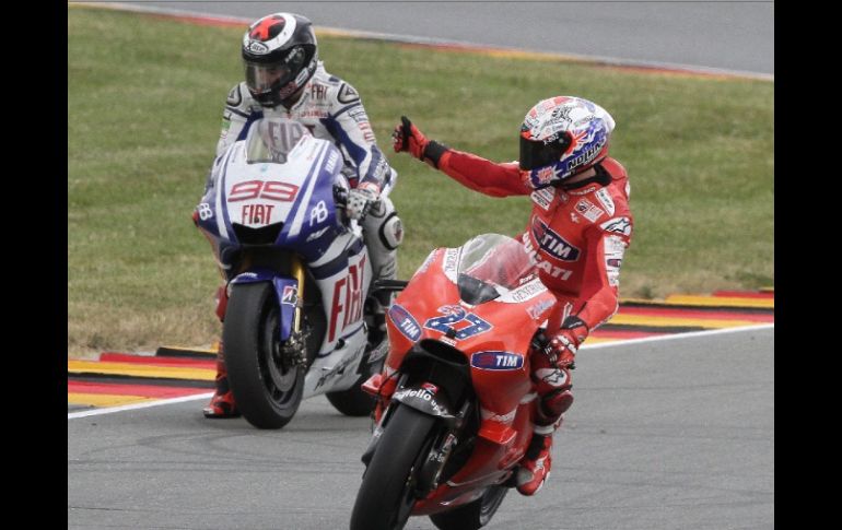 Deportes | Clasificación oficial de entrenamientos Español Lorenzo se clasifica en primero en el MotoGP El piloto español salió avante en una guerra de declaraciones que intentaban desmotivarlo Por: EFE 17 de julio de 2010 - 08:24 hs El piloto Casey Stoner, que quedó en segundo lugar, felicita a Lorenzo por clasificarse en primero. REUTERS / SACHSENRING, ALEMANIA (17/JUL/2010).- El español Jorge Lorenzo (Yamaha YZR M 1) devolvió las aguas a su cauce a pesar de todos los comentarios del fin de semana en el que el italiano Valentino Rossi (Yamaha YZR M 1) regresó a la competición y sumó su cuarto mejor tiempo consecutivo de entrenamientos. Rossi, que quiso meter a Lorenzo en una guerra dialéctica con sus declaraciones en la que no entró el español, al final se ha tenido que conformar con la quinta plaza de entrenamientos a casi seis décimas de segundo de su propio compañero de equipo. Así quedó la clasificación oficial de entrenamientos para el Gran Premio de Alemania de MotoGP que el próximo domingo 18 de julio se disputará en el circuito de Sachsenring. MotoGP Pilotos Tiempo 1. Jorge Lorenzo (España/Yamaha YZR M 1) 1:21.817 a 161.526 km/h. 2. Casey Stoner (Australia/Ducati Desmosedici) 1:21.841 3. Dani Pedrosa (España/Honda RC 212 V) 1:21.948 4. Andrea Dovizioso (Italia/Honda RC 212 V) 1:22.263 5. Valentino Rossi (Italia/Yamaha YZR M 1) 1:22.395 6. Héctor Barberá (España/Ducati Desmosedici) 1:22.454 7. Randy de Puniet (Francia/Honda RC 212 V) 1:22.610 8. Marco Simoncelli (Italia/Honda RC 212 V) 1:22.624 9. Aleix Espargaró (España/Ducati Desmosedici) 1:22.910 10. Marco Melandri (Italia/Honda RC 212 V) 1:22.917 11. Mika Kallio (Finlandia/Ducati Desmosedici) 1:22.961 12. Colin Edwards (Estados Unidos/Yamaha YZR M 1) 1:23.026 13. Ben Spies (Estados Unidos/Yamaha YZR M 1) 1:23.028 14. Loris Capirossi (Italia/Suzuki GSV RR) 1:23.040 15. Nicky Hayden (Estados Unidos/Ducati Desmosedici) 1:23.090 16. Álvaro Bautista (España/Suzuki GSV RR) 1:23.193 Vuelta más rápida de entrenamientos: Jorge Lorenzo (España/Yamaha YZR M 1), 1:21.817 a 161.526 km/h. Récord del circuito: Dani Pedrosa (España/Honda RC 212 V), 1:22.126 a 160.918 km/h. (2009) Récord de vuelta más rápida: Casey Stoner (Australia/Suzuki GSV RR), 1:21.067 a 163.020 km/h. (2008). Temas Motociclismo Moto GP Recibe las últimas noticias en tu e-mail Todo lo que necesitas saber para comenzar tu día Registrarse implica aceptar los Términos y Condiciones
