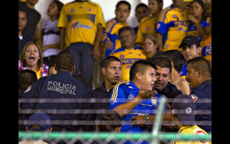 Deportes | La FMF advirtió con censurar al Nou Camp por hechos violentos en partido ante Tigres Estadio del León sería vetado por desmanes La FMF multó al León y advirtió con censurar al Nou Camp por hechos violentos en partido ante Tigres Por: NTX 16 de octubre de 2012 - 07:25 hs Imagen del desalojo de las personas de la tribunas del estadio en el encuentro del pasado sábado 13 de octubre. ARCHIVO / CIUDAD DE MÉXICO (16/OCT/2012).- La Comisión Disciplinaria de la Federación Mexicana de Futbol (FMF) multó con dos mil 300 días de salario mínimo al Club León y emitió un aviso de veto para el estadio Nou Camp, por los hechos de violencia que se registraron en la tribuna en el juego ante Tigres de la UANL. "Dicha sanción se debe a los disturbios presentados en las tribunas del inmueble al finalizar el encuentro León vs. Tigres del pasado sábado 13 de octubre de 2012, correspondiente a la Jornada 13 del Torneo de Apertura 2012 de la LIGA MX, donde hubo golpes entre los aficionados en la tribuna, así como a miembros de seguridad", explicó. Los hechos se registraron en el segundo tiempo de dicho duelo, cuando la gente de seguridad desalojó de las tribunas a los aficionados de Tigres de la UANL. El cuadro que dirige el uruguayo Gustavo Matosas se ubica en el tercer puesto de la tabla general con 24 unidades, muy cerca de alcanzar un sitio en la liguilla. Temas Futbol Mexicano Tigres Panzas Verdes de León FMF Recibe las últimas noticias en tu e-mail Todo lo que necesitas saber para comenzar tu día Registrarse implica aceptar los Términos y Condiciones