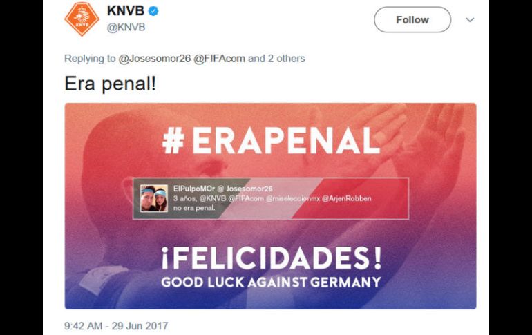 GUADALAJARA, JALISCO (29/JUN/2017).- A tres años de aquel fatídico encuentro entre la Selección Mexicana y Holanda, en donde el Tri quedó eliminado con un gol provocado por un polémico penal sobre Arjen Robben en el Mundial de Brasil 2014 la herida sigue abierta.Esta mañana se convirtió en tendencia en Twitter el #NoEraPenal, como ha sucedido cada año en esta fecha, sin embargo, no solo son los mexicanos quienes lo recuerdan. La Federación Holandesa de Futbol utilizó su cuenta de Twitter para burlarse de un tuitero y decirle: Era penal.Todo inició cuando el usuario de Twitter @Josesomor26 mandó el siguiente mensaje:"3 años, @KNVB @FIFAcom @Miseleccionmx @ArjenRobben no era penal".Entre las personas que estaban mencionadas en el tuit estaba la Federación holandesa que no dudó en responder. Lo hizo a través de una imagen en donde utiliza el #EraPenal, acompañado de un recorte de pantalla del tuit del mexicano y terminó con un "Felicidades, buena suerte ante Alemania".Cabe hacer mención que @Josesomor26, que se identifica como "ElPulpoMOr", ha tuiteado todos los días durante los últimos tres años el mismo mensaje, actualizando las fechas, por ejemplo:@Josesomor26: 2 años, 363 días, @KNVB @FIFAcom @miseleccionmx @ArjenRobben no era penal.@Josesomor26: 2 años, 354 días, @KNVB @FIFAcom @miseleccionmx @ArjenRobben no era penal.Aun así, mensaje de los holandeses no fue bien recibido por los usuarios mexicanos que reaccionaron con frases como: "Nos vemos en el mundial", "No van a llegar al mundial" y claro, #NoEraPenal.Sobre el tema de la clasificación a Rusia 2018, los Países Bajos se encuentran en el tercer lugar de su grupo, por debajo de Suecia y Francia.EL INFORMADOR/ PATRICIA GALLARDO