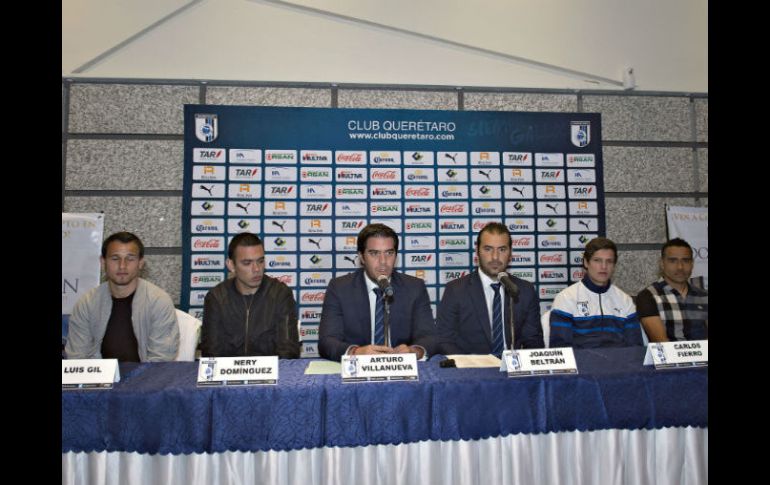 Deportes | El club presentó de manera oficial a Luis Gil, Nery Domínguez y Carlos Fierro Gallos Blancos presenta a refuerzos Luis Gil, Nery Domínguez y Carlos Fierro fueron presentados de forma oficial para el inicio del Clausura 2016 Por: NTX 7 de enero de 2016 - 21:49 hs Arturo Villanueva y Joaquín Beltrán fueron los encargados de dar la bienvenida a la tercia de jugadores. MEXSPORT / I. Ortiz QUERÉTARO, QUERÉTARO (07/ENE/2016).- Gallos Blancos de Querétaro presentó este día de forma oficial a sus tres refuerzos para el Torneo Clausura 2016 de la Liga MX, el cual arranca este viernes cuando reciba al Atlas. El presidente del club, Arturo Villanueva, y el presidente deportivo, Joaquín Beltrán, fueron los encargados de dar la bienvenida a la tercia de jugadores. Los elementos de Gallos Blancos presentados fueron los mediocampistas, el estadunidense Luis Gil y el argentino Nery Domínguez, quien recién llegó al club y por ende se perderá el inicio del certamen. Además de ellos aterrizó al cuadro queretano el atacante Carlos Fierro para competir por un lugar con Luis Madrigal, Édgar Benítez, Ángel Sepúlveda y Emmanuel Villa. Los dirigentes aprovecharon también para presentar a Ricardo Esqueda, elemento que volvió al seno de Gallos Blancos, luego que entre 2013 y 2014 defendió los colores del club. "Luis Gil tiene trayectoria importante, más de 120 partidos jugados como profesional. Fue capitán con Estados Unidos en el Preolímpico. Para nosotros viene a reforzar de buena manera la media cancha, tiene buen trato con la pelota, buena mentalidad y preparación, se ha integrado bien al plantel", apuntó Villanueva sobre el estadunidense. En lo que respecta a Carlos Fierro señaló que "tiene varias funciones en la cancha. Puede ayudar en la media, adelante, por la banda. Está contento de llegar aquí. Lo recibimos con gusto y con la intención de respaldarlo en lo que necesite". Sobre el pampero Domínguez mencionó que "estuvo nominado a 11 ideal de la Liga Argentina. Dará clase y dinámica al medio campo. Pronto podría estar en su selección por su calidad". Temas Futbol Mexicano Gallos Blancos de Querétaro Liga MX Clausura 2016 Lee También Chivas Femenil, a una victoria de asegurar su lugar en Liguilla México busca frenar el paso perfecto de Argentina en Mundial Sub-20 Lista actualizada de selecciones que ya clasificaron al Mundial 2026 Mundial 2026 traerá derrama millonaria al país Recibe las últimas noticias en tu e-mail Todo lo que necesitas saber para comenzar tu día Registrarse implica aceptar los Términos y Condiciones