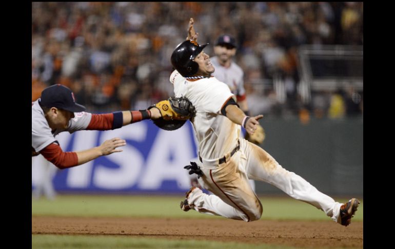 Deportes | El equipo de San Francisco empata la serie en la Liga Nacional Gigantes derrotan a Cardenales 7x1 La serie se traslada ahora para San Luis, donde a partir del miércoles se efectuarán los partidos 3, 4 y 5 Por: AFP 15 de octubre de 2012 - 22:20 hs El jardinero derecho de San Francisco, Gregor Blanco (d), trata de evitar ser tocado por el primera base Allen Craig. EPA / SAN FRANCISCO, ESTADOS UNIDOS (15/OCT/2012).- Los Gigantes de San Francisco aplastaron el lunes a los Cardenales de St. Louis 7x1 y empataron así la serie por el campeonato de la Liga Nacional a una victoria para cada bando, gracias a oportuna ofensiva del boricua Angel Pagán, el venezolano Marco Scutaro y Ryan Theriot. Los Gigantes contaron también con excelente labor monticular del derecho Ryan Vogelsong (1-0), que trabajó siete sólidos episodios, en los que esparció cuatro hits y una carrera con cuatro ponches. El revés fue para el también derecho Chris Carpenter (0-1), quien aún presenta un excelente récord en postemporada con balance de 10-2, pero en esta ocasión cedió cinco carreras y seis imparables en cuatro capítulos. La serie -de siete a ganar cuatro- se traslada ahora para St. Louis, donde a partir del miércoles efectuarán los partidos 3, 4 y 5, con un duelo de pitcheo en el primero entre Matt Cain (Gigantes) y Kyle Lohse (Cardenales). El peso ofensivo en la victoria estuvo a cargo de Pagán, con un jonrón, y Scutaro y Theriot, que empujaron dos carreras cada uno. El ganador de este tope se coronaría en la Liga Nacional y avanzaría a discutir la Serie Mundial contra el ganador de la Liga Americana entre los Yankees de Nueva York y los Tigres de Detroit, que favorece a estos últimos por 2-0. Temas Beisbol MLB Cardenales de San Luis Gigantes de San Francisco Lee También Charros gana un juego lleno de drama, apagones y lluvia en Mexicali Charros apadrinan a 35 academias deportivas en Jalisco México vuelve a tener presencia en la Serie Mundial con un nuevo representante ¿Dónde ver EN VIVO el partido de J14 Pumas vs San Luis? Recibe las últimas noticias en tu e-mail Todo lo que necesitas saber para comenzar tu día Registrarse implica aceptar los Términos y Condiciones