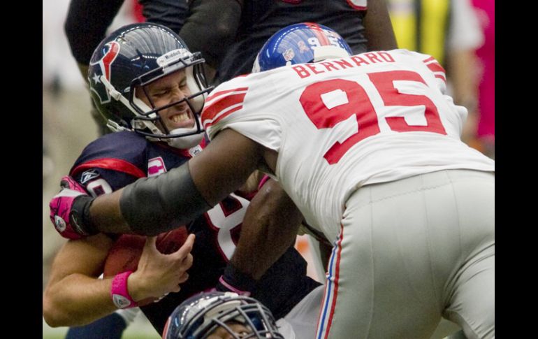 Deportes | El conjunto del mariscal de campo Eli Manning,gana por 34-10 ante los texanos Gigantes gana con limitaciones El conjunto del mariscal de campo Eli Manning,gana por 34-10 ante los texanos Por: AP 10 de octubre de 2010 - 16:44 hs Los Gigantes de Nueva York detienen a la defensa texana.REUTERS / HOUSTON, TEXAS (10/OCT/2010). - Eli Manning lanzó dos de sus tres pases de anotación a Hakeem Nicks y los Gigantes de Nueva York limitaron el domingo a Houston a una ganancia de sólo 24 yardas por tierra -la cifra más baja en la historia de la franquicia- para derrotar a los texanos por 34-10. Nicks terminó con cifras récord en su carrera de 12 recepciones y avance de 130 yardas, en otro gran día para un receptor contra la porosa defensiva de los texanos. Manning finalizó con 27 pases completos de 42 para ganancia de 297 yardas, y ejecutó su tercer pase de touchdown a Steve Smith en el cuarto período. Osi Umenyiora capturo dos veces al mariscal de campo de los Texas Matt Schaub y también provocó un balón suelto para los Giants (3-2). Nueva York contuvo al corredor líder de la NFL Arian Foster a un avance de 25 yardas en 11 acarreos. El apoyador Brian Cushing realizó cuatro tacleadas sin asistencia en su debut con Houston (3-2). Cushing fue suspendido los cuatro primeros juegos por violar la política de la NFL sobre sustancias prohibidas. Temas NFL Futbol Americano Gigantes de Nueva York Texanos de Houston Lee También México encadena cuatro partidos sin ganar, algo que no sucedía desde 2021 ¿Dónde ver Argentina vs Colombia: semifinal del Mundial Sub-20? ¿Quién es el líder del cártel del "Mencho" que cayó en Guadalajara? Calendario de partidos de la J13 del Apertura 2025 Recibe las últimas noticias en tu e-mail Todo lo que necesitas saber para comenzar tu día Registrarse implica aceptar los Términos y Condiciones