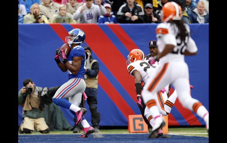 Deportes | Nueva York vence 41-27 a los Cafés de Cleveland que sin sin victoria en la campaña Gigantes viene de atrás para ganar Nueva York vence 41-27 a los Cafés de Cleveland que sin sin victoria en la campaña Por: AP 7 de octubre de 2012 - 15:47 hs Víctor Cruz atrapa uno de los tres pases de anotación que tuvo en el partido ante Cleveland. AP / EAST RUTHERFORD, NUEVA JERSEY (07/OCT/2012).- Víctor Cruz estableció un récord personal al atrapar tres pases de touchdown para guiar a los Gigantes de Nueva York a una victoria por 41-27 el domingo sobre los Cafés de Cleveland, que siguen sin triunfos en la temporada. Cruz capturó tres pases de touchdown del mariscal Eli Manning para cubrir 3, 7 y 28 yardas. Además, Ahmad Bradshaw alcanzó las 200 yardas en acarreos en la temporada, su mayor total. Tenía 132 antes del partido. Los Gigantes tienen foja de 9-0 en partidos en los acumulan 100 o más yardas por tierra. Nueva York (3-2) también forzó tres pérdidas del balón, incluyendo una intercepción de Chase Blackburn en la zona de anotación en el cuarto período. Temas NFL Futbol Americano Gigantes de Nueva York Cafés de Cleveland Recibe las últimas noticias en tu e-mail Todo lo que necesitas saber para comenzar tu día Registrarse implica aceptar los Términos y Condiciones