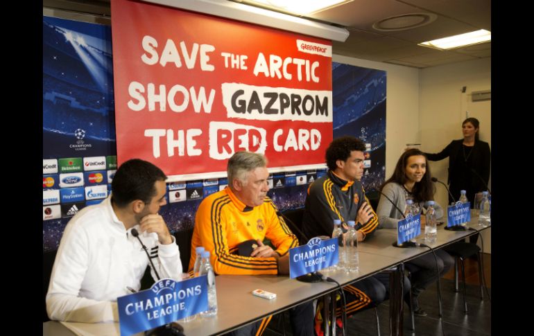 Deportes | Un cartel de la organización fue colocado a espaldas del técnico Carlo Ancelotti Greenpeace aparece en conferencia de Real Madrid Un cartel de la organización fue colocado a espaldas del técnico Carlo Ancelotti Por: AFP 9 de diciembre de 2013 - 12:44 hs MADRID, ESPAÑA (09/DIC/2013).- Un cartel de Greenpeace en contra de las extracciones petrolíferas de Gazprom en el Ártico interrumpió este lunes la rueda de prensa de Carlo Ancelotti y el portugués Pepe, en la víspera del partido que disputará el Real Madrid en Copenhague, perteneciente a la Liga de Campeones. Mientras Pepe respondía a los periodistas, una pancarta se descolgó detrás del futbolista con el lema 'Salvemos al Ártico, saca la tarjeta roja a Gazprom'. Los agentes daneses presentes en la conferencia lo retiraron mientras Pepe y Ancelotti sonreían por lo ocurrido. Esta acción de Greenpeace es la segunda de la organización ecologista en Liga de Campeones esta temporada. En octubre, durante la disputa del Basilea-Schalke, desplegaron una pancarta gigante en St. Jakob Park. Temas Futbol Internacional Greenpeace Real Madrid Recibe las últimas noticias en tu e-mail Todo lo que necesitas saber para comenzar tu día Registrarse implica aceptar los Términos y Condiciones