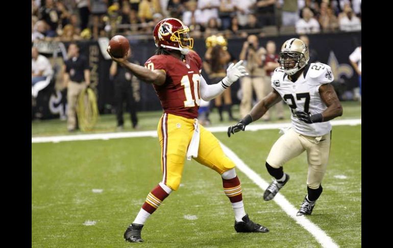Deportes | Washington vence de manera sorpresiva a los Santos 40-32 en el Superdome Griffin brilla en triunfo de Pieles Rojas Washington vence de manera sorpresiva a los Santos 40-32 en el Superdome Por: EL INFORMADOR 9 de septiembre de 2012 - 16:18 hs Robert Griffin tuvo un gran inicio de temporada ante los Santos. AP / NUEVA ORLEANS, LOUISIANA (09/SEP/2012).- Robert Griffin III inició su carrera en la NFL completando 19 de 26 pases para ganancia de 320 yardas y dos touchdowns, y los Pieles Rojas de Washington vencieron el domingo por 40-32 a los Santos. Nueva Orleans sufrió la derrota en su primer juego desde el escándalo de incentivos por lesionar a jugadores adversarios y que ensombreció el receso. Griffin concretó sus ocho primeros pases, incluido uno de 88 yardas para anotación a Pierre Garcon, empatando el segundo pase de anotación más largo para un quarterback que hace su debut en la NFL. El running back novato Alfred Morris ganó 96 yardas por tierra con dos touchdowns. Aldrick Robinson, debutante en la liga profesional, tuvo una recepción para touchdown entre cuatro atrapadas para avance total de 52 yardas. Drew Brees, inusualmente, tuvo problemas con su precisión, completando sólo 46% de sus envíos, con dos intercepciones. Pero sus 339 yardas ganadas por pase y tres TDs mantuvieron a los Saints en el juego hasta que su último pase, desesperado, fue controlado por Reed Doughty cerca de la línea de anotación de los Pieles Rojas. Temas NFL Futbol Americano Pieles Rojas de Washington Santos de Nueva Orleans Recibe las últimas noticias en tu e-mail Todo lo que necesitas saber para comenzar tu día Registrarse implica aceptar los Términos y Condiciones
