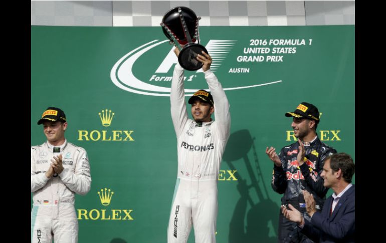 AUSTIN, TEXAS (23/OCT/2016).- El piloto británico Lewis Hamilton (Mercedes) ganó este domingo el Gran Premio de Estados Unidos, disputado en el circuito de Austin, y recortó siete puntos al líder del Mundial de Fórmula Uno, su compañero alemán Nico Rosberg, que fue segundo, seguido del australiano Daniel Ricciardo (Red Bull), que completó el podio.Hamilton logró en Austin la victoria número 50 de su carrera en la Fórmula Uno, la séptima de la presente temporada y la tercera consecutiva en el circuito tejano. Con los 25 puntos que sumó este domingo alcanza los 305 puntos, por 331 de Rosberg, por lo que la distancia se queda en 26 puntos a falta de tres carreras.El alemán Sebastian Vettel (Ferrari) fue cuarto, seguido por el español Fernando Alonso (McLaren-Honda), quinto después de adelantar en las últimas vueltas a dos monoplazas. Uno de ellos fue su compatriota Carlos Sainz (Toro Rosso), sexto tras ser rebasado en la última vuelta, y otro el brasileño Felipe Massa (Williams), séptimo.Completaron la zona de puntos del Gran Premio de Estados Unidos el mexicano Sergio Pérez (Force India), el británico Jenson Button (McLaren-Honda) y el francés Romain Grosjean (Haas).Revive aquí el minuto a minuto.