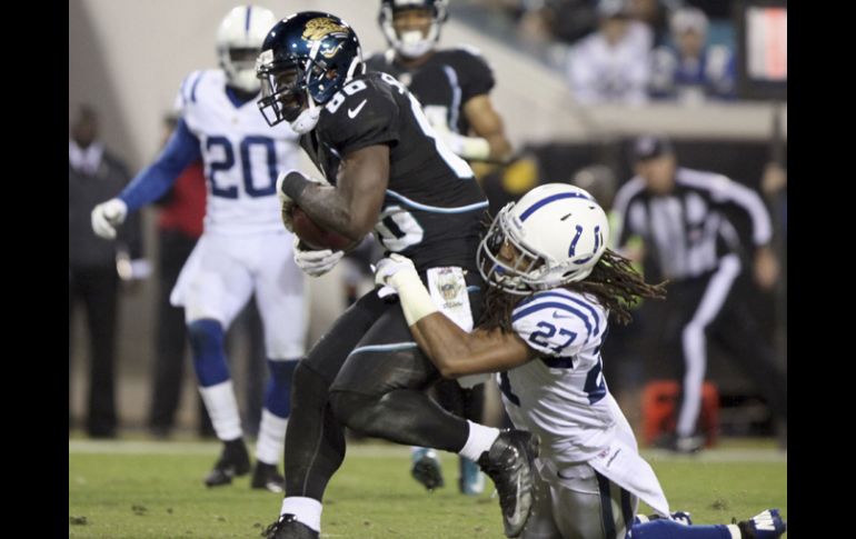 Deportes | Potros liga su cuarta victoria de la temporada Indianápolis vence a Jacksonville Los Potros de Indianápolis lograron extender su racha de victorias al vencer a los Jaguares de Jacksonville por 27-10 Por: NTX 8 de noviembre de 2012 - 23:44 hs El receptor de los Jaguares de Jacksonville, Micheal Spurlock es derribado por Josh Gordy de los Potros de Indianápolis. REUTERS / JACKSONVILLE, ESTADOS UNIDOS (09/NOV/2012).- El mariscal de campo novato Andrew Luck consiguió dos anotaciones terrestres y con ello guió a Potros de Indianápolis a extender a cuatro su racha de triunfos en fila al derrotar a Jaguares de Jacksonville por 27-10. Al iniciar la décima fecha de la campaña regular de la NFL, Indianápolis mejora su marca a seis partidos ganados por tres perdidos y se afianzó en el segundo sitio de la División Sur de la Conferencia Americana. En tanto con el descalabro, el sexto que sufre de manera consecutiva, Jacksonville sigue en el sótano de ese sector con marca de un triunfo por ocho reveses. Luck, quien completó 18 de 26 pases que hizo para una ganancia de 227 yardas con una intercepción, logró sus anotaciones terrestres en el segundo cuarto al llegar a las diagonales en carreras de cinco y una yarda. El esquinero Darius Butler colaboró con otro touchdown más cuando en el tercer cuarto, tras interceptar un pase del mariscal de campo Blaine Gabbert, recorrió 11 yardas hasta llegar a las diagonales y el veterano pateador Adam Viniatieri contribuyó con dos goles de campo de 31 yardas en el primer cuarto y de 41 yardas en el último período. Jacksonville logró sus puntos gracias a un gol de campo de 40 yardas de Johs Scobee en el segundo cuarto y a un pase de anotación de touchdown de cuatro yardas del mariscal de campo Chad Henne con su receptor abierto Cecil Shorts. Anotación por cuartos: Indianápolis 3 14 7 3 -- 27 Jacksonville 0 3 0 7 -- 10 Temas NFL Futbol Americano Potros de Indianápolis Jaguares de Jacksonville Lee También Futbol hoy 12 de octubre de 2025: ¿Dónde ver los partidos en vivo? Nos quedamos con sensaciones cortas: Eduardo Arce Hay jugadores que no estuvieron a la altura: Javier Aguirre César Montes intenta justificar la goleada ante Colombia Recibe las últimas noticias en tu e-mail Todo lo que necesitas saber para comenzar tu día Registrarse implica aceptar los Términos y Condiciones