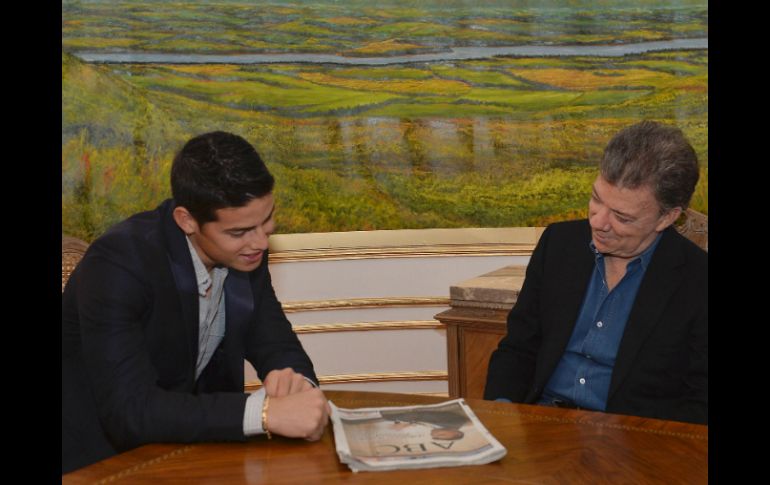 Deportes | El presidente y el jugador se reunieron con motivo de la visita del mandatario a España Juan Manuel Santos se reúne con James Rodríguez en Madrid El presidente y el jugador se reunieron con motivo de la visita del mandatario a España Por: NTX 2 de noviembre de 2014 - 15:59 hs Durante la entrevista, se habló del golazo que ayer metió el delantero del Real Madrid. EFE / C. Carrión BOGOTÁ, COLOMBIA (02/NOV/2014).- El presidente de Colombia, Juan Manuel Santos y el jugador del club español Real Madrid, James Rodríguez, se reunieron hoy con motivo de la visita que realiza el mandatario a España, informó el gobierno del país sudamericano. La presidencial Casa de Nariño, señaló este domingo en su página web que en el encuentro, el jefe de Estado elogió el trabajo del futbolista colombiano, a quien definió como un "embajador volante". "Hablamos del golazo que metió el día de ayer (sábado contra el Granada por la Liga española), hablamos de la importancia para el país de lo que él está haciendo" en el futbol internacional y en la selección, dijo Santos. El mandatario afirmó que "cada vez que James sale a jugar con el Real Madrid y cada vez que mete un gol: vibra Colombia, nos llena de orgullo y es un embajador volante que tenemos, que nos enorgullece cada vez que se luce". " James lo ve uno en España, en cualquier país europeo o latinoamericano, es el colombiano hoy más famoso, sin duda alguna. Es un orgullo. Pero también tenemos otros colombianos que se están luciendo: (Carlos) Bacca y (Radamel) Falcao", agregó el presidente. Santos llegó a la capital española, donde comenzará una gira por Europa que lo llevará a Bélgica, Portugal, Alemania, Francia y Reino Unido, en busca de apoyo económico para el proceso de paz y un eventual posconflicto. Temas Colombia Futbol Internacional Real Madrid Juan Manuel Santos James Rodríguez Lee También Chivas y América calientan en redes el Clásico Nacional de la Fecha FIFA Esta es la última guerra que Trump resolvió, según él mismo Barcelona interesado en Gilberto Mora, esto es lo que se sabe Sociales: El Informador inicia una nueva etapa con la moderna imprenta "Doña Stella" Recibe las últimas noticias en tu e-mail Todo lo que necesitas saber para comenzar tu día Registrarse implica aceptar los Términos y Condiciones