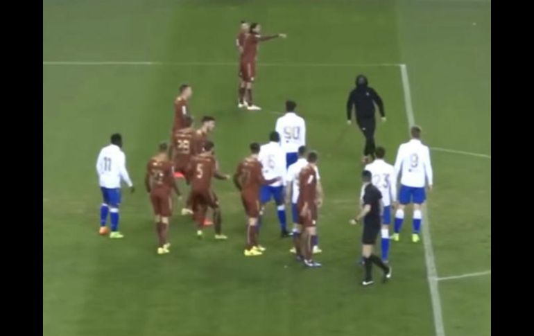 GUADALAJARA, JALISCO (13/MAR/2017).- Mientras en México el futbol se mete en problemas por jugadores que agreden a árbitros, en Croacia un grupo de futbolistas ayudó a un árbitro para evitar que un aficionado lo golpeara.Los hechos quedaron grabados en un video que se ha hecho viral en las últimas horas. Ocurrieron durante un tenso partido en el Estadio Poljud entre los equipos Hajduk Split y Rijeka, cuando un hombre vestido de negro y la con la cara cubierta brincó al campo, con un palo de metal que parece un selfie-stick, y corrió hacia donde estaba el árbitro.Se trataba de un juego de clasificación en la liga croata y el árbitro acababa de marcar un penalti dudoso que empató el partido, lo cual hizo que muchos aficionados protestaran. Según algunos medios, el hombre que brincó al campo salió de entre la barra Torcida Split —el nombre recuerda a la afición brasileña—, acusada de conductas ilícitas en juegos pasados.En el video se ve cómo el hombre se dirige el árbitro, quien corre para ponerse a salvo. Mientras los futbolistas lo evitan o lo ven con extrañeza, el hombre da una vuelta alrededor de ellos y finalmente un jugador lo sigue mientras le pide que salga.El hombre se dirige a tribunas, al parecer dispuesto a dejar el campo, y empieza a arengar a la gente en esa zona. Varios segundos después, la policía llega y lo arresta.