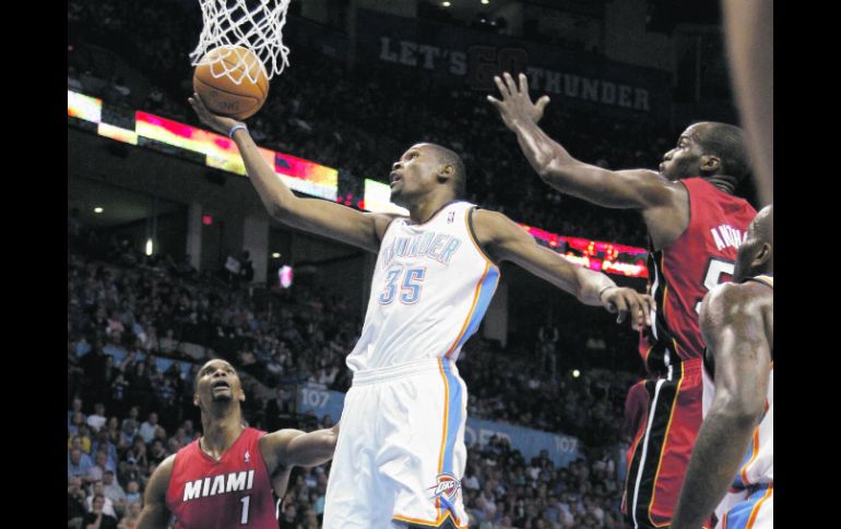 Deportes | El Thunder se impone 103-87 al Heat, en un choque entre dos contendientes al título Kevin Durant y Oklahoma fulminan al Miami El Thunder se impone 103-87 al Heat, en un choque entre dos contendientes al título Por: EL INFORMADOR 26 de marzo de 2012 - 04:15 hs Kevin Durant (centro) ejecuta un tiro a la canasta, ante la marcación de Chris Bosh (izquierda). REUTERS / OKLAHOMA, ESTADOS UNIDOS (26/MAR/2012).- Kevin Durant anotó 28 puntos, ganó nueve rebotes y empató su marca de la temporada de ocho asistencias, Kendrick Perkins agregó 16 unidades, su mayor cifra de la campaña, y el Thunder de Oklahoma City apaleó por 103-87 al Heat de Miami. Los dos contendientes al título iniciaron el día empatados con la segunda mejor marca de la NBA, tres juegos atrás de los Bulls de Chicago en la lucha por el lugar de mejor preclasificado para la postemporada. Oklahoma City ganó ayer cuando consiguió 13 robos de balón, su mayor número de la temporada, y obligó a Miami a perder el balón en 21 ocasiones, lo que se tradujo en 28 puntos del Thunder. Dwyane Wade encabezó la ofensiva de Miami con 22 unidades, pero también perdió el balón en seis ocasiones, su mayor cantidad de la campaña. LeBron James registró 17 puntos, siete asistencias y cuatro balones perdidos. Kevin Durant superó el duelo frente al “Trío Mágico” de Miami (LeBron James, Dwyane Wade y Chris Bosh). Esta vez el juego defensivo de los Thunder también fue mejor al recuperar 13 balones, su mejor marca de la temporada, y forzaron a los Heat a que cometiesen 21 perdidas de balón, que las convirtieron en 28 puntos. James Harden y el congolés Serge Ibaka secundaron a Durant en el ataque con 9 tantos cada uno. El africano, además, capturó 10 rebotes. Kevin Love se echa a Minnesota al hombro El ala-pívot Kevin Love logró doble-doble de 30 puntos y 21 rebotes y llevó a los Timberwolves de Minnesota a la victoria por 117-100 sobre los Nuggets de Denver y rompieron racha de dos derrotas consecutivas. El protagonismo y aportación de Love al frente del ataque y defensa de los Timberwolves (24-26) fue la clave una vez más que consiguiesen la victoria, la tercera en los últimos 10 partidos disputados. Love llegó al partido después que la noche del viernes aportó también un doble-doble de 51 puntos, su mejor registro encestador de la temporada y 14 rebotes, ante los Thunder de Oklahoma, en el encuentro que perdieron en doble prórroga por 149-140 El ala-pívot All-Star de los Timberwolves consiguió el séptimo partido con 30-20 más puntos y rebotes desde que llegó a la NBA y fue el noveno encuentro esta temporada con 30 puntos y al menos 15 rebotes. El base Luke Ridnour consiguió 25 puntos y dio seis asistencias, mientras que el escolta reserva Wayne Ellington encestó 17 para el equipo de Minnesota, que marcha undécimo en la Conferencia Oeste, a 2.5 juegos de los Rockets de Houston, octavos de ese grupo. El ala-pívot novato Kenneth Faried con 17 puntos lideró el ataque de los renovados y diezmados Nuggets (26-23), que perdieron el segundo partido consecutivo y están fuera de la lista de los ocho mejores de la Conferencia Oeste que le da derecho a disputar la fase final. El base Ty Lawson y el reserva Andre Miller aportaron 14 puntos cada uno, mientras que el pívot JaVale McGee, que llegó en el puesto del brasileño Nené Hilario, traspasado a los Wizards de Washington, también salió del banquillo, y logró un doble-doble de 13 tantos, 11 rebotes y dos tapones. Los Nuggets se encontraron con una desventaja de 25 puntos (68-43) al irse al descanso y nunca tuvieron opción de conseguir la victoria al presentar un equipo diezmado con las lesiones del alero italiano Danilo Gallinari, el español Rudy Fernández y el escolta Arron Afflalo, suspendido por golpear con el codo al alero de los Jazz de Utah, Gordon Hayward, el pasado viernes. AP/EFE ACTIVIDAD DOMINICALResultados Phoenix 108 Cleveland 83 Denver 100 Minnesota 117 Washington 76 Boston 88 Utah 133 Atlanta 139 Filadelfia 76 Sacramento 93 Golden State 87 Portland 90 Temas NBA Basquetbol Miami Heat Recibe las últimas noticias en tu e-mail Todo lo que necesitas saber para comenzar tu día Registrarse implica aceptar los Términos y Condiciones