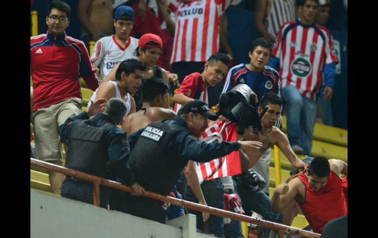 Deportes | Condenaron la bronca entre porras y policías en el Clásico Tapatío La FMF deja investigación a autoridades del Jalisco Condenaron la bronca entre porras y policías en el Clásico Tapatío Por: EFE 23 de marzo de 2014 - 12:34 hs CIUDAD DE MÉXICO (23/MAR/2014).- La Federación Mexicana de Futbol (Femexfut) condenó hoy la bronca entre hinchas del Atlas y del Guadalajara ocurrida este sábado en el estadio Jalisco. La Liga MX y la Femexfut "desaprueban los lamentables actos de violencia" en el estadio Jalisco durante el partido del Atlas y el Guadalajara, señalaron en un comunicado de prensa. Las autoridades que manejan el futbol en México anunciaron que apoyarán "en todo momento" la investigación de las autoridades del estadio Jalisco para identificar y castigar a los responsables de "tan penosos actos". Al final del partido se registró en las tribunas una bronca entre aficionados del Atlas y del Guadalajara, que después se intensificó cuando todos ellos se enfrentaron a la policía que intervino para tratar de detenerlos. El Atlas y el Guadalajara empataron 1-1 en este partido, correspondiente a la duodécima jornada del torneo Clausura 2014 del futbol mexicano. Temas Chivas Atlas Futbol Mexicano Clásico Tapatío Policía de Guadalajara FMF Estadio Jalisco Liga MX Lee También Futbol hoy 10 de octubre de 2025: ¿Dónde ver los partidos en vivo? Astros de Jalisco toma ventaja sobre Xalapa en la semifinal de zona Atlas aprovecha la pausa para recuperar elementos clave Detienen a presunto homicida en Lomas de Oblatos Recibe las últimas noticias en tu e-mail Todo lo que necesitas saber para comenzar tu día Registrarse implica aceptar los Términos y Condiciones