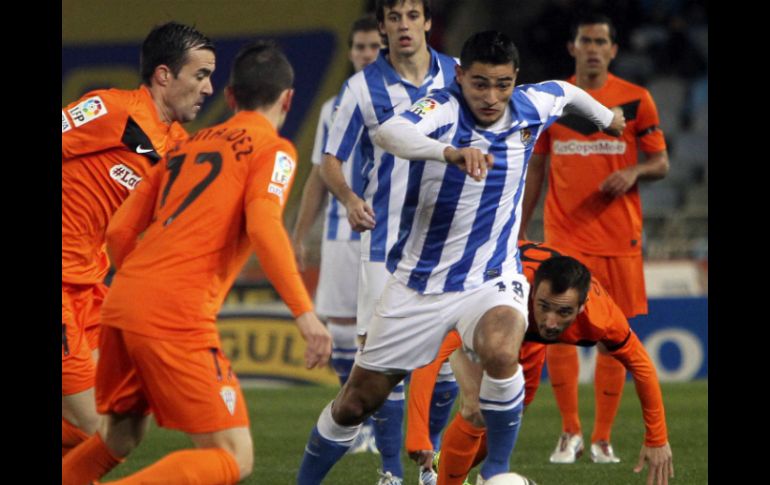 Deportes | Carlos Vela no pudo evitar que su equipo quedará fuera del torneo La Real Sociedad, eliminada de la Copa La Real Sociedad fue eliminada de la Copa del Rey por el Córdoba Por: EFE 27 de noviembre de 2012 - 14:13 hs El delantero de la Real Sociedad, Gonzalo ''Chori'' Castro (d), trata de avanzar ante Fernández (2-i) y Garay (i). EFE / SAN SEBASTIÁN, ESPAÑA (27/NOV/2012).- La Real Sociedad de San Sebastián volvió a caer a las primeras de cambio de la Copa del Rey, esta vez ante un Córdoba que ya ganó 2-0 en la ida y que en la vuelta arrancó un empate 2-2 en Anoeta. Los jugadores del equipo donostiarra salieron volcados en busca de la remontada y, aunque no empezaron muy finos, en el minuto 20 Antoine Griezmann, el mejor jugador realista, marcó el primer tanto en una acción reclamada como posible fuera de juego. El Córdoba no se amilanó y sin llegar a tener claras ocasiones sí dio algunos sustos ayudado por los nervios defensivos que terminaron por contagiar a Zubikarai. En el tramo final de la primera parte Saízar desvió con muchos apuros un remate de Chory Castro que casi va a gol. Salió fuerte el equipo andaluz en la segunda parte y Dubarbier elevó la tensión de la grada en un buen disparo que casi bate a Zubikarai. Los donostiarras tuvieron el 2-0 en un remate de Xabi Prieto pero fue Kiko el que estableció en el minuto 65 el empate a uno y Dubarbier, con un gran zurdazo, el 1-2 que hundió a los guipuzcoanos. En el tramo final y para la estadística Agirretxe marcó el gol del empate a pase de su compañero Estrada. Ficha técnica: 2 - Real Sociedad: Zubikarai; Estrada, Mikel González, Iñigo Martínez, José Ángel; Illarramendi (Ifrán, min. 68), Rubén Pardo, Zurutuza (Xabi Prieto, min. 49); Griezmann (Vela, min. 77), Chory Castro y Agirretxe. 2 - Córdoba: Saizar; Fuentes, Gaspar, Fernández, Kiko; López Garay, Caballero (Alberto, min. 75); Dubarbier; López Silva (Cristian, min. 68), Patiño (Vico, min. 80) y Abel. Goles: 1-0, min. 20: Griezmann. 1-1, min. 65: Kiko. 1-2, min. 72: Dubarbier. 2-2, min. 84: Agirretxe. Árbitro: Ayza Gámez (Valencia). Tarjeta amarilla José Ángel, Fernández y a Caballero. Incidencias: 17 mil aficionados en una noche de lluvia constante en Anoeta. Temas Copa del Rey Futbol Español Futbol Internacional Carlos Vela Lee También Colombia exhibe a México con goleada en Arlington México vs Colombia • Momentos destacados • Partido amistoso México cae ante Argentina y termina el sueño mundialista en Chile México vs Argentina • Momentos Destacados • Cuartos de Final • Mundial Sub-20 Recibe las últimas noticias en tu e-mail Todo lo que necesitas saber para comenzar tu día Registrarse implica aceptar los Términos y Condiciones
