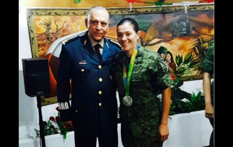 CIUDAD DE MÉXICO (02/SEP/2016).- Los medallistas olímpicos que pertenecen a la Secretaría de la Defensa Nacional (Sedena) recibieron un reconocimiento de manos del titular de la dependencia, Salvador Cienfuegos Zepeda, por el éxito que tuvieron en Río 2016.''Con su ejemplo y dedicación sirven de guía para sus compañeros y subalternos, poniendo en alto el nombre y prestigio del Ejército y Fuerza Aérea Mexicanos, tanto en nuestro país, como en el mundo'', destacó.María Espinoza, cabo auxiliar en Educación Física y Deportes, ganadora de plata, fue la primera en pasar al podio en la explanada del Cuartel General Damián Carmona, en el Campo Militar 1-A. El segundo fue el clavadista Germán Sánchez (plata).El tercero en pasar fue Ismael Hernández, quien también tiene rango en el Ejército de cabo auxiliar en Educación Física y Deportes.Los deportistas recibieron felicitaciones y aplausos. Cuatro de las cinco medallas que ganó México en Brasil son de elementos de las Fuerzas Armadas.