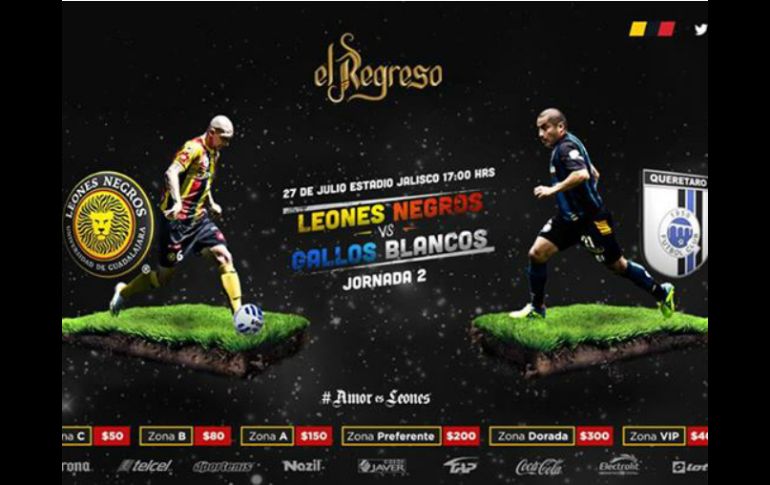 Deportes | El cuadro universitario pone precios accesibles para sus seguidores Leones Negros quiere lleno el Jalisco El cuadro universitario pone precios accesibles para sus seguidores Por: EL INFORMADOR 25 de julio de 2014 - 18:29 hs Por medio de las redes sociales, dan a conocer los precios para el partido ante Gallos Blancos. Tomada de Facebook de Leones Negros. ESPECIAL / GUADALAJARA, JALISCO (25/JUL/2014).- Con precios accesibles, Leones Negros regresará como equipo de Primera División al estadio Jalisco tras 20 de años de ausencia. A través de sus redes sociales, la directiva universitaria dio a conocer los precios para el partido del domingo de la Jornada 2 del Apertura 2014 ante Gallos Blancos de Querétaro, los cuales van desde 50 pesos hasta 400 pesos. Los puntos de venta son las taquillas del estadio Jalisco, instalaciones de la Universidad de Guadalajara como el Teatro Diana y Auditorio Telmex; por internet a través del sistema Ticketmaster. Asimismo, continúa a la venta la Tarjeta Negra para los juegos como local, la cual tiene costo de tres mil 200 pesos para la zona Preferente, dos mil 450 para la Dorada; mil 230 para la zona B y 845 pesos para la zona C. Boletos para el duelo ante Querétaro: Área Precios Zona VIP 400 pesos. Zona Dorada 200 pesos. Zona A 150 pesos. Zona B 80 pesos. Zona C 50 pesos. EL INFORMADOR / ROBERTO ALARCÓN Temas Futbol Mexicano Estadio Jalisco Leones Negros Gallos Blancos de Querétaro Liga MX Apertura 2014 Lee También ¿Quién ganará el partido entre las América y Chivas? Esto dice la IA Policía de Zapopan realiza cinco detenciones en una semana México vs. Argentina: Hora de alzar el pecho La sinfonía teutona suena en Sinsheim Recibe las últimas noticias en tu e-mail Todo lo que necesitas saber para comenzar tu día Registrarse implica aceptar los Términos y Condiciones