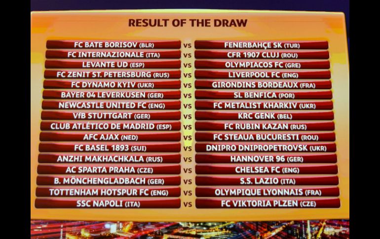 Deportes | Atlético-Rubin Kazan y Levante-Olympiakos entre los duelos más atractivos Listos los dieciseisavos y octavos en la Europa League Atlético-Rubin Kazan y Levante-Olympiakos entre los duelos más atractivos de los dieciseisavos Por: EL INFORMADOR 20 de diciembre de 2012 - 08:05 hs El día de hoy se llevó a cabo el sorteo en la sede de la UEFA en Nyon. AFP / NYON, SUIZA (20/DIC/2012).- El Atlético de Madrid se enfrentará contra el Rubin Kazan ruso y el Levante contra el Olympiacos griego en la ronda de dieciseisavos de final de la Europa League, cuyos partidos se celebrarán el 14 y 21 de febrero. El Atlético de Madrid y el Levante se medirán en los octavos de final de la Liga Europa siempre que en la eliminatoria previa superen al Rubin Kazan ruso y al Olympiacos griego, respectivamente, según ha deparado el sorteo celebrado hoy en la sede de la UEFA en Nyon (Suiza). Dieciseisavos de final: BATE (BLR)-Fenerbahce (TUR) Inter Milán (ITA)-Cluj (RUM) Levante (ESP)-Olympiacos (GRE) Zenit St Petersburgo (RUS)-Liverpool (ING) Dinamo Kiev (UCR)-Girondins de Burdeos (FRA) Bayer Leverkusen (GER)-Benfica (POR) Newcastle United (ING)-Metalist (UCR) Stuttgart (GER)- Genk (BEL) Atlético de Madrid (ESP)-Rubin Kazan (RUS) Ajax (HOL)-Steaua Bucurest (RUM) Basilea (SUI)-Dnipro (UCR) Anzhi (RUS)-Hannover (GER) Sparta Praga (CZE)-Chelsea (ING) Borussia Mönchengladbach (GER)-Lazio (ITA) Tottenham Hotspur (ING)-Olympique Lyon (FRA) Nápoles (ITA)-Viktoria Plzen (CZE) Los partidos de ida se jugarán el jueves 14 de febrero de 2013 y los de vuelta el 21 del mismo mes. Octavos de final: Nápoles (ITA)-Viktoria Plzen (CZE) / BATE (BLR)-Fenerbahce (TUR) Bayer Leverkusen (GER)-Benfica (POR)/ Dinamo Kiev (UCR)-Girondins de Burdeos (FRA) Anzhi (RUS)-Hannover (GER)/ Newcastle United (ING)-Metalist (UCR) Stuttgart (GER)- Genk (BEL)/ Borussia Mönchengladbach (GER)-Lazio (ITA) Tottenham Hotspur (ING)-Olympique Lyon (FRA)/ Inter Milán (ITA)-Cluj (RUM) Levante (ESP)-Olympiacos (GRE)/ Atlético de Madrid (ESP)-Rubin Kazan (RUS) Basilea (SUI)-Dnipro (UCR)/ Zenit St. Petersburgo (RUS)-Liverpool (ING) Ajax (HOL)-Steaua Bucurest (RUM)/ Sparta Praga (CZE)-Chelsea (ING) Los encuentros de ida de se disputarán el jueves 7 de marzo y los de vuelta el día 14 del mismo mes. Con información de AFP Temas Futbol Internacional Europa League Atlético de Madrid UEFA Lee También La generación dorada del 2005 se apaga con el retiro de Héctor Moreno Cruz Azul vs América • Momentos Destacados • Jornada 13 • Apertura 2025 Chivas vs Mazatlán • Momentos Destacados • Jornada 13 • Apertura 2025 México cae ante Corea del Norte en su debut del Mundial Sub-17 Femenil Recibe las últimas noticias en tu e-mail Todo lo que necesitas saber para comenzar tu día Registrarse implica aceptar los Términos y Condiciones