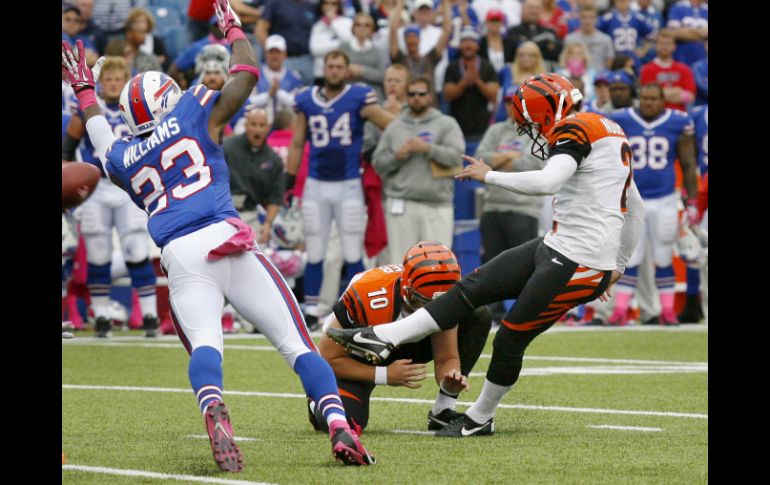 Deportes | Con un gol de campo, Cincinnati se impone a los Bills con resultado de 27-24 Los Bengalíes ganan en tiempo extra Con un gol de campo, Cincinnati se impone a los Bills con resultado de 27-24 Por: AP 13 de octubre de 2013 - 16:14 hs Mike Nugent (D) patea en tiempo extra el gol de campo de la victoria. AP / ORCHARD PARK, NUEVA YORK (13/OCT/2013).- Mike Nugent pateó un gol de campo de 43 yardas a falta de 6:44 para el final del tiempo extra para que los Bengalíes de Cincinnati derrotasen el domingo 27-24 a los Bills de Buffalo. Brandon Tate avanzó 29 yardas tras un despeje, allanando el camino para la anotación decisiva. Andy Dalton, el mariscal de campo de los Bengalíes, completó 26 de sus 40 pases para 337 yardas, con tres anotaciones y una intercepción. Se recuperó tras una sequía de dos partidos sin lograr anotaciones, y llevó a los Bengalíes (4-2) a su primera victoria como visitantes de la temporada. Los Bills (2-4) fueron liderados por el mariscal de campo Thad Lewis, en lugar del novato EJ Manuel (fuera por lesión). Lewis completó 19 de 32 pases para 216 yardas y dos anotaciones. Ambas anotaciones fueron en el último cuarto, incluyendo una con un pase de 40 yardas a Marquise Goodwin con 1:08 por jugar. Lewis, en apenas su segundo partido como titular, también anotó con un acarreo. Temas NFL Futbol Americano Bills de Buffalo Bengalíes de Cincinnati Recibe las últimas noticias en tu e-mail Todo lo que necesitas saber para comenzar tu día Registrarse implica aceptar los Términos y Condiciones