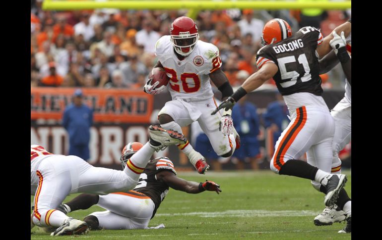 Deportes | Vencen a Cleveland por marcador de 16-14 Los Jefes están irreconocibles Kansas City tiene su mejor inicio en cinco años al estar con marca de 2-0 Por: EL INFORMADOR 19 de septiembre de 2010 - 19:56 hs Thomas Jones (20) durante un acarreo de pelota. REUTERS / CLEVELAND, OHIO (19/SEP/2010).- Dos victorias en al misma semana tiene a los Jefes de Kansas City con un inicio impactante en al temporada. Brandon Flowers regreso una intercepción para anotación y Ryan Soccup pateo tres goles de campo para consumar la victoria sobre los Cafés de Cleveland por marcador de 16-14. Los Jefes habían vencido el pasado lunes a los Cargadores de San Diego para ponerse con marca de 2-0 por primera ocasión desde el 2005. EL corredor de los Cafés, Jerome Harrison, fue limitado a 33 yardas en 16 acarreos, y Seneca Wallace quien comenzó en el lugar de Jake Delhomme, quien se lesionó el tobillo derecho la semana pasada en su debut con los Browns (0-2), terminó 16-de-31 pases para 229 yardas. Temas NFL Futbol Americano Cafés de Cleveland Jefes de Kansas City Lee También Ulises Dávila se declara culpable por amaño de partidos; recibirá sentencia en diciembre El Real Oviedo destituye a Veljko Paunovic Mundial Sub-20: EU golea a Italia y enfrentará a Marruecos NFL: Sorpresiva derrota de los Eagles ante Giants Recibe las últimas noticias en tu e-mail Todo lo que necesitas saber para comenzar tu día Registrarse implica aceptar los Términos y Condiciones