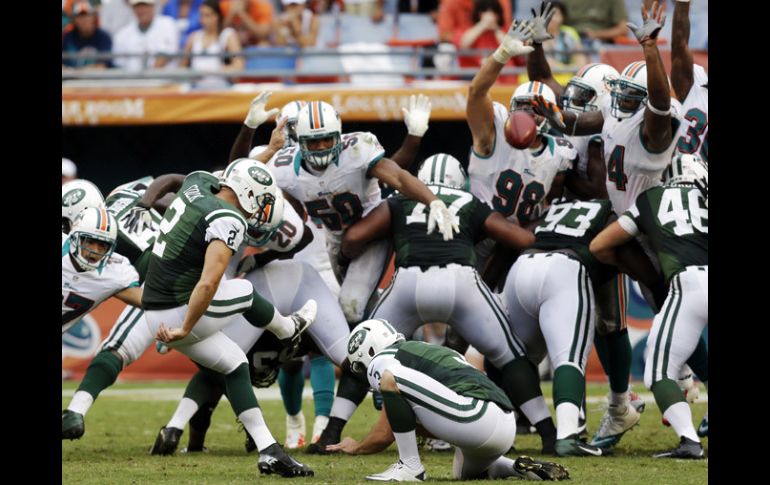 Deportes | Un gol de campo de Folk le da la victoria a Nueva York 23-20 sobre Delfines Los Jets ganan en tiempo extra Un gol de campo de Folk le da la victoria a Nueva York 23-20 sobre Delfines Por: AP 23 de septiembre de 2012 - 16:06 hs Nick Folk (2) conecta el balón para darle el triunfo a los Jets en tiempo extra. AP / MIAMI, FLORIDA (23/SEP/2012).- Nick Folk recibió una segunda oportunidad para patear un gol de campo y lo hizo desde 33 yardas, con 6:04 minutos por jugarse, para darle una ventaja definitiva a los Jets de Nueva York el domingo en la victoria 23-20 sobre los Delfines de Miami. Mark Sánchez conectó un pase con Santonio Holmes para 38 yardas y que preparó el terreno para el intento de gol de campo. Dos jugadas después, la patada de Folk fue bloqueada, pero los árbitros anularon la jugada debido a que los Delfines habían pedido tiempo. Después, Folk metió el gol de campo victorioso. En la posesión previa, el pateador Dan Carpenter de los Delfines falló el intento de gol de campo de 48 yardas que le hubiera dado la victoria a Miami. Nueva York se puso 2-1 en la temporada, mientras que Miami cayó a 1-2. Darrelle Revis de los Jets y Reggie Bush de Miami abandonaron el encuentro con lesiones en la rodilla izquierda. Temas NFL Futbol Americano Delfines de Miami Jets de Nueva York Lee También México vs Colombia • Momentos destacados • Partido amistoso México vs Argentina • Momentos Destacados • Cuartos de Final • Mundial Sub-20 "Chucky" Lozano reconoce que jugaría en Chivas o en América Dónde ver EN VIVO el México vs Argentina por el Mundial Sub-20 Recibe las últimas noticias en tu e-mail Todo lo que necesitas saber para comenzar tu día Registrarse implica aceptar los Términos y Condiciones