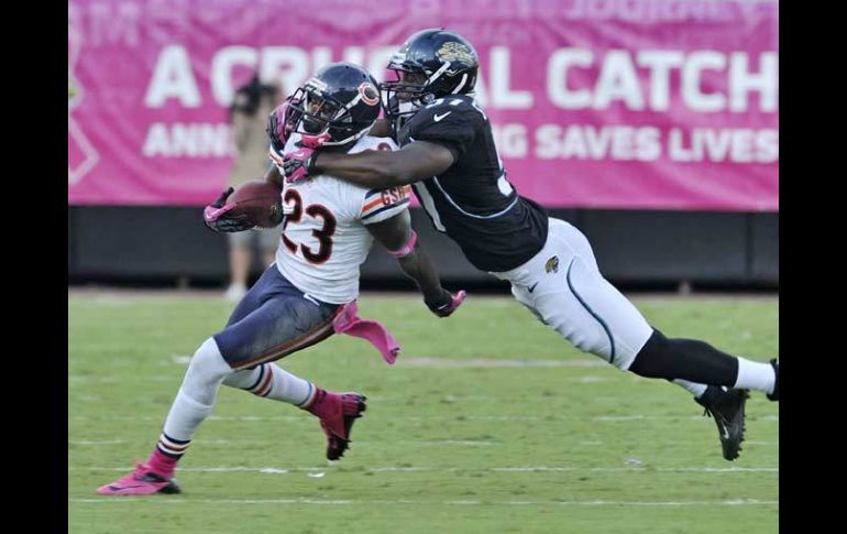 Deportes | Chicago apabulla con su defensiva a los Jaguares 41-3 Los Osos siguen sumando victorias Chicago apabulla con su defensiva a los Jaguares 41-3 Por: AP 7 de octubre de 2012 - 19:28 hs Devin Hester (23) es derriba en una acción del partido. AP / JACKSONVILLE, FLORIDA (09/OCT/2012).- Charles Tillman y Lance Briggs anotaron touchdowns tras intercepciones por segunda ocasión en seis días, y los Osos de Chicago aprovecharon una defensa agobiante para apabullar 41-3 el domingo a los Jaguares de Jacksonville. Los Osos (4-1) anotaron 38 puntos sin respuesta, incluyendo 35 en la segunda mitad, y así ganar su tercer partido consecutivo. La racha tiene todo que ver con la defensa. Chicago ha convertido cinco intercepciones en touchdowns en las últimas tres semanas. Tillman y Briggs consiguieron dos de esas intercepciones en la victoria del lunes por 34-18 en Dallas. El safety Major Wright convirtió otra la semana previa contra San Luis. La segunda intercepción para touchdown de Tillman esta temporada, para 36 yardas en el tercer cuarto, fue histórica. Fue la primera ocasión desde 1950 en que Chicago convirtió intercepciones en touchdowns en tres encuentros consecutivos. Los Jaguares (1-4) nunca se recuperaron y jugaron el último cuarto en medio de abucheos. Temas NFL Futbol Americano Jaguares de Jacksonville Osos de Chicago Lee También Eligen a Tijuana como sede de entrenamiento para Mundial 2026 Tabla de goleo Liga MX: Posiciones tras la Jornada 13 del Apertura 2025 Así queda la tabla general de la Liga MX tras la J13 del Apertura 2025 Mundial Sub-20: ¿Dónde ver EN VIVO la final Argentina vs. Marruecos? Recibe las últimas noticias en tu e-mail Todo lo que necesitas saber para comenzar tu día Registrarse implica aceptar los Términos y Condiciones
