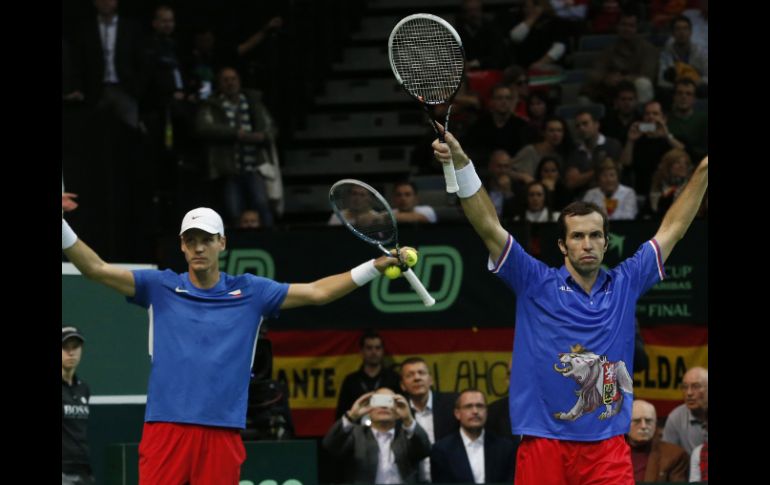 Deportes | Berdych y Stepanek ganan el encuentro de dobles, se colocan 2-1 ante españoles Los checos sacan ventaja sobre España Berdych y Stepanek ganan el encuentro de dobles y República Checa está 2-1 sobre España Por: AP 17 de noviembre de 2012 - 10:48 hs Tomas Berdych y Radek Stepanek festejan su triunfo sobre los españoles en el encuentro de dobles. AP / PRAGA, REPÚBLICA CHECA (17/NOV/2012).- Tomas Berdych y Radek Stepanek ganaron el sábado el encuentro de dobles y República Checa sacó ventaja de 2-1 sobre España en la final de la Copa Davis. Los checos se impusieron 3-6, 7-5, 7-5, 6-3 sobre los españoles Marcel Granollers y Marc López, para quedar a ley de un punto de conquistar su primera Ensaladera de Plata como nación independiente. Checoslovaquia ganó el título de la Davis en 1993. Berdych y Stepanek se impusieron en su tercer match point para el delirio de los más de 13 mil hinchas en la Arena O2 de Praga. La pareja tiene marca de 12-1 en partidos de dobles en la Davis. Berdych, sexto del ranking mundial, puede sentenciar la final el domingo en el primer partido de sencillos contra David Ferrer. España busca su cuarto título en los cinco últimos años. Temas Tenis Copa Davis ATP Torneos de tenis Lee También Novak Djokovic avanza a semifinales del Masters de Shanghái Sabalenka mantiene su racha ganadora No solo Puma, estas son las colecciones de tenis para Día de Muertos 2025 (FOTOS) El tenis ahora es de los deportes favoritos en Guadalajara Recibe las últimas noticias en tu e-mail Todo lo que necesitas saber para comenzar tu día Registrarse implica aceptar los Términos y Condiciones