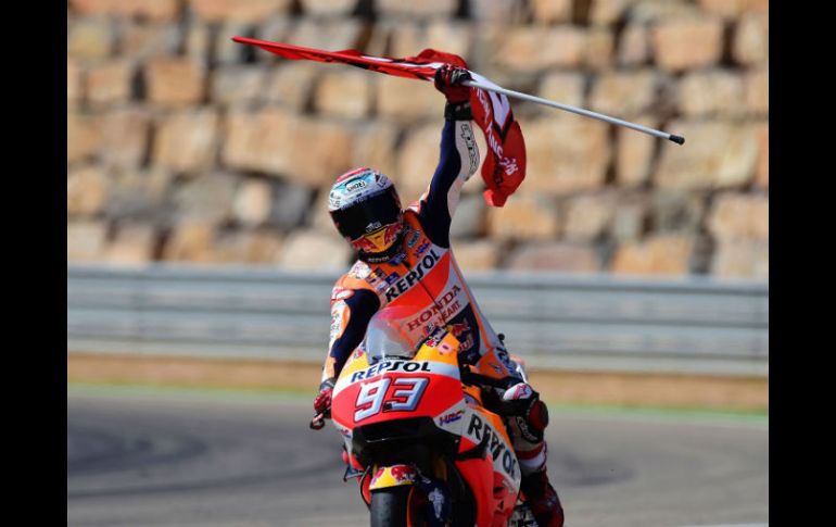 ALCAÑIZ, ESPAÑA (25/SEP/2016).- El español Marc Márquez (Honda) ganó este domingo el Gran Premio de Aragón de MotoGP, aumentando su ventaja en la cabeza del Mundial con el italiano Valentino Rossi (Yamaha), tercero en el circuito de Alcañiz.Márquez, campeón mundial en 2013 y 2014, consiguió su cuarta victoria de la temporada por delante de su compatriota Jorge Lorenzo (Yamaha) que fue segundo.Tras Rossi finalizaron el también español Maverick Viñales (Suzuki), que fue cuarto, y el británico Cal Crutchlow (Honda), quinto.El italiano cuenta ahora con 52 puntos de desventaja con el líder, cuando restan cuatro carreras para acabar la temporada."No empecé de la mejor manera, pero ataqué en las primeras vueltas porque sabía que mi ritmo era mejor. Tenía la intención de escaparme, pero cometí un error y acabé muy atrás. Al recuperar, volví a alcanzar el liderazgo de la carrera y aguanté, con cabeza, para evitar que Rossi me recorte más puntos de cara al campeonato", analizó Márquez, que había logrado la pole position.