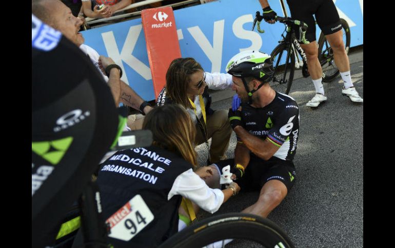 VITTEL, FRANCIA (04/JUL/2017).- El ciclista británico Mark Cavendish, del Dimension Data, ha tenido que retirarse del Tour de Francia al sufrir rotura de la clavícula derecha, según ha informado su equipo.El corredor británico se cayó cuando disputaba el sprint que finalizaba en Vittel al recibir un codazo del eslovaco Peter Sagan y aunque logró cruzar la línea de meta con el brazo en cabestrillo, se ha visto obligado a abandonar la ronda francesa.Sagan, campeón del mundo, fue descalificado del Tour de Francia por esa maniobra considerada como peligrosa, según informó el presidente del jurado de comisarios, el belga Philippe Marien.En un primer momento el ciclista eslovaco fue sancionado con 30 segundos, lo que le situaba último de la etapa, pero tras la revisar las imágenes de la acción el jurado decidió su expulsión.