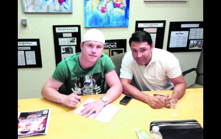 Óscar de la Hoya publicó en su cuenta de Twitter la foto del momento en que Saúl Álvarez firma el contrato para enfrentar a Mayweather ESPECIAL /