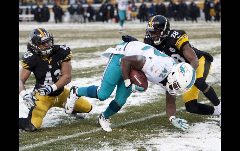 Deportes | Los Delfines se imponen a los Acereros 34-28 en juego con mal clima Miami brilla en medio de la nevada Los Delfines se imponen a los Acereros 34-28 en juego con mal clima Por: AP 8 de diciembre de 2013 - 16:21 hs Charles Clay (C) llega a la zona de anotación, definiendo el encuentro frente a los Acereros. AP / PITTSBURGH, PENNSYLVANIA (08/DIC/2013).- Una vez que los Delfines de Miami se acostumbraron a la nieve los Acereros no fueron un obstáculo. Charles Clay atrapó dos envíos para anotación, entre ellos uno de 12 yardas enviado por Ryan Tannehill cuando restaban 2:53 minutos de juego y los Delfines de Miami vencieron el domingo 34-28 a los Acereros de Pittsburgh. Daniel Thomas acarreó el balón para 105 yardas de ganancia y una anotación. Su escapada en zigzag en un nevado campo del Heinz Field de Pittsburgh preparó la escena para el pase de la victoria. Tannehill tuvo 20 pases completos de 33 intentos para ganancia de 201 yards y tres anotaciones por los Delfines (7-6). Miami desperdició una ventaja de 10 puntos en el tercer cuarto pero regresó para ganar por tercera vez en sus últimos cuatro encuentros. Ben Roethlisberger lanzó pases para 297 yardas y tres anotaciones pero los Acereros (5-8) perdieron por segunda vez en fila y están casi eliminados de la lucha por la postemporada. Antonio Brown llegó a la zona de anotación luego de varios pases laterales de los Acereros pero los árbitros dijeron que había salido del campo antes de anotar. Temas NFL Futbol Americano Delfines de Miami Acereros de Pittsburgh Lee También Futbol hoy 13 de octubre de 2025: ¿Dónde ver los partidos en vivo? Así se jugarán las Semifinales del Mundial Sub-20 El Tricolor entrenó en Guadalajara tras la humillación ante Colombia México Sub-20 regresa al país tras eliminación ante Argentina Recibe las últimas noticias en tu e-mail Todo lo que necesitas saber para comenzar tu día Registrarse implica aceptar los Términos y Condiciones