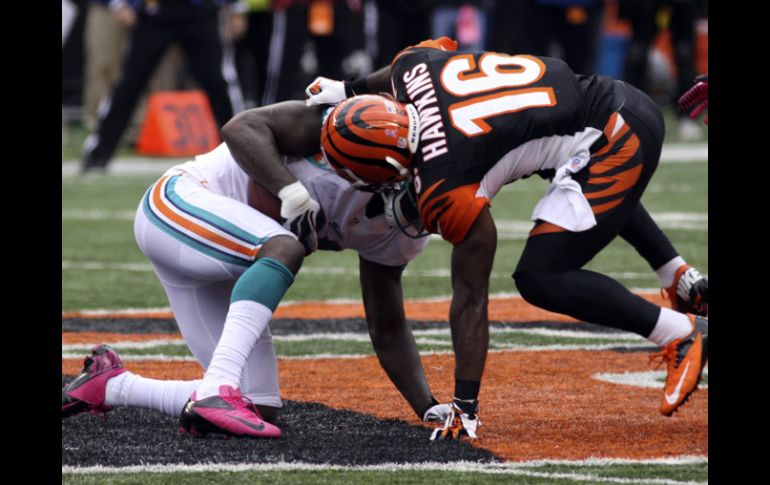 Deportes | Jones preserva el triunfo de los Delfines al interceptar un pase al final del juego Miami gana a los Bengalíes Jones preserva el triunfo de los Delfines al interceptar un pase al final del juego Por: EFE 7 de octubre de 2012 - 15:51 hs Reshad Jones (izq) interceptó un pase para darle el triunfo a los Delfines. AP / CINCINNATI, OHIO (07/OCT/2012).- El defensivo Reshad Jones interceptó un pase del mariscal de campo Andy Dalton cuando restaba un minuto y veintidós segundos para el final y mantuvo el triunfo de los Delfines de Miami por 13-17 en la cancha de los Bengalíes de Cincinnati. Los Delfines recuperaron la forma después de perder los pasados dos partidos en el tiempo extra y para nada sintieron la frustración ante un rival que llegaba de haber conseguido tres victorias consecutivas. Esta vez la defensa de los Delfines contuvo a los Bengalíes, que no hicieron mucho por conseguir el triunfo. El mariscal de campo de los Delfines, el novato Ryan Tannehill, de 24 años, completó 17 de 26 pases para 223 yardas y dejó en 92.3 su índice pasador. Por los Bengalíes, el 'pateador' Mike Nugent falló un intento de gol de campo de 42 yardas cuando restaban tres minutos para el final, y los Delfines sólo tuvieron que dejar correr el reloj. El 'quarterback' de los Bengalíes, Dalton, completó 26 de 43 pases para 234 yardas, con pase de anotación, y un envío interceptado. Temas NFL Futbol Americano Delfines de Miami Bengalíes de Cincinnati Lee También México busca frenar el paso perfecto de Argentina en Mundial Sub-20 CEO de Coca-Cola aclara si retiraría patrocinio del Super Bowl Lista actualizada de selecciones que ya clasificaron al Mundial 2026 Mundial 2026 traerá derrama millonaria al país Recibe las últimas noticias en tu e-mail Todo lo que necesitas saber para comenzar tu día Registrarse implica aceptar los Términos y Condiciones