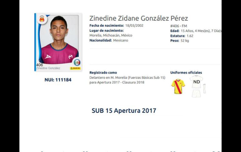 GUADALAJARA, JALISCO (25/JUL/2017).- El cuadro mexicano de Monarcas Morelia presume de tener en su cantera a un jugador de nombre curioso. Se trata de Zinedine Zidane González Pérez, quien milita en las categorías inferiores, más claramente en el equipo Sub-15.Llamado en honor al mítico ex jugador francés, este muchacho hace evidente la admiración que se tiene en su familia por el actual entrenador del Real Madrid.Según la ficha que la Liga MX publica en su sitio oficial de Internet, el joven de 15 años es originario de Morelia, capital del estado de Michoacán en el año 2002, y juega para el ya mencionado club como delantero. En la presente temporada que acaba de iniciar, ya sumó sus primeros minutos ante los Rayos de Necaxa el pasado fin de semana.Entre otras cosas, llama la atención que el futbolista aparece en el equipo monarca junto a un joven con nombre alusivo a otra leyenda, pero del futbol mexicano: es compañero del plantel junto a Luis Gabriel Rey Mejía, homónimo del colombiano Luis Gabriel Rey, quien tuviera actividad 17 años en el balompié azteca y que precisamente fuera figura en el cuadro purépecha.Otros jugadores jóvenes del futbol mexicano que han sido nombrados en honor a estrellas del futbol son Ronaldo Zinedine Hernández, en las fuerzas básicas de Santos, y su compañero Ronaldo Cisneros, quien fuera bautizado en honor al también ex delantero del Real Madrid y figura de la Selección Verdeamarela, el brasileño Ronaldo Nazário.