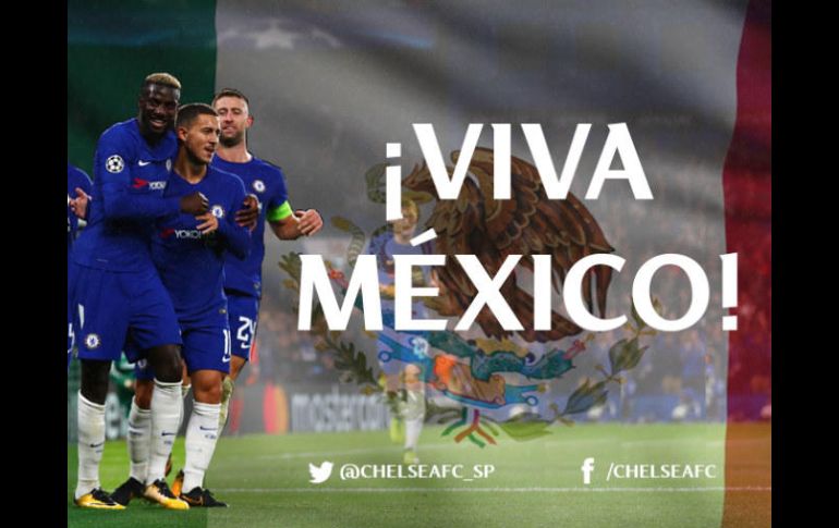 CIUDAD DE MÉXICO (16/SEP/2017).- Como ya es tradición en algunas partes del mundo, la conmemoración de la Independencia de México no pasa desapercibida y algunos equipos mandaron sus felicitaciones por medio de redes sociales.El Chelsea, como cada año, felicitó a los "Blues" mexicanos por las Fiestas Patrias que se conmemoran en este mes.Asimismo, La Liga mandó sus felicitaciones a través de Facebook con una imagen en la que aparecen Andrés Guardado, jugador del Betis y la jugadora del Levante, Charlyn Corral.Los Steelers de Pittsburgh no se quedaron atrás y con el siguiente mensaje mandaron sus felicitaciones: "Feliz Día México, un país de puro acero".