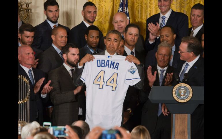 Deportes | El presidente de EU rinde homenaje a los campeones de la Serie Munial 2015 Obama recibe a los Reales en la Casa Blanca El presidente de EU rinde homenaje a los campeones de la Serie Munial 2015 Por: AP 21 de julio de 2016 - 19:16 hs El equipo le entregó a Obama una franela de los Reales con el número 44 estampado con una caligrafía dorada. AFP / P. Lynch WASHINGTON, ESTADOS UNIDOS (21/JUL/2016).- Para el presidente Barack Obama, los apodos de los Reales de Kansas City necesitan tener algo más de ingenio. Pero todo lo demás es formidable al rendir homenaje el jueves en la Casa Blanca a los campeones de la Serie Mundial de 2015, describiéndoles como uno de los "equipos más aguerridos y completo que hemos visto en mucho tiempo". La última vez que los Reales visitaron a la Casa Blanca fue en 1985, cuando el extinto presidente Ronald Reagan destacó su "mentalidad tenaz". El equipo de 2015 relució esa misma calidad. A seis outs de quedar eliminados en los playoffs, los Reales anotaron siete veces para vencer a los Astros de Houston en la primera ronda, y luego doblegaron a los Azulejos de Toronto y a los Mets de Nueva York. Obama subrayó que los Reales son dueños del récord de más victorias viniendo de atrás en los playoffs. El mandatario también reconoció que había transcurrido muchísimo tiempo de la última visita de los Reales a la Casa Blanca: "Hay que aceptarlo, fue un largo trayecto para los fanáticos de los Reales. Fueron muchos años malos, algunas décadas durísimas". Pero Obama destacó que todo empezó a cambiar cuando el gerente general Dayton Moore tomó las riendas y los Reales le pusieron énfasis a la formación de talento en su sistema de ligas menores, con piezas como el jardinero Alex Gordon, los infielders Mike Moustakas y Eric Hosmer, y el receptor venezolano Salvador Pérez. Obama mencionó los apodos de cada uno de esos jugadores: "Gordo," ''Moose," ''Hos" y "Salvy". Pero el presidente no se mostró muy impresionado con los mismos. "Vamos a tener trabajar en esos", dijo Obama. El equipo le entregó a Obama una franela de los Reales con el número 44 estampado con una caligrafía dorada, que hizo juego con las cortinas del East Room de la Casa Blanca. Temas Barack Obama MLB Reales de Kansas City Serie Mundial 2015 Lee También Dónde ver EN VIVO los juegos de MLB, HOY 11 de octubre México vs Argentina: ¿Quién ganará el partido según la IA? Dónde ver EN VIVO el México vs Argentina por el Mundial Sub-20 Peleas de box hoy sábado 11 de octubre: horarios y dónde ver la cartelera completa Recibe las últimas noticias en tu e-mail Todo lo que necesitas saber para comenzar tu día Registrarse implica aceptar los Términos y Condiciones