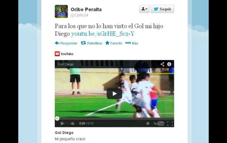 El tuit se lee: "Para los que no lo han visto el Gol mi hijo Diego http://youtu.be/sGrHE_Scz-Y fue como el seleccionado dio a conocer la hazaña de su pequeño hijo En el vídeo, se muestra al pequeño cómo se abre camino de entre sus demás compañeros de equipo y sus contrincantes hasta llegar a unos metros de la portería contraria, donde patea el balón que pasa de entre las manos del arquero logrando así la anotación. El tuit fue publicado alrededor de las 15:00 horas de este domingo y hasta el momento cuenta con 108 retuits y 185 favoritos de sus seguidores en Twitter. Oribe Peralta se encuentra junto con el Tri entrenando en Nueva Zelanda en vísperas del próximo encuentro con el equipo seleccionado ese país que se celebrará el próximo miércoles a las 00:30 hora de México.EL INFORMADOR / CAROLINA QUINTANILLA