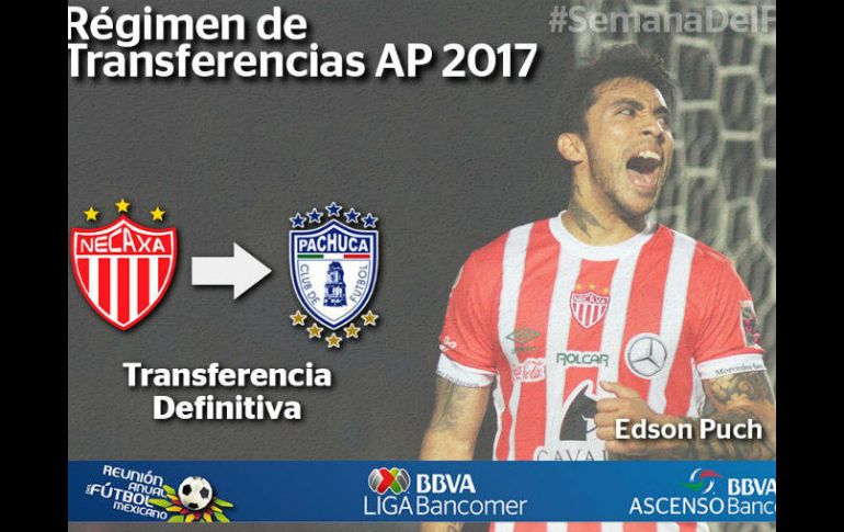 GUADALAJARA, JALISCO (07/JUN/2017).- Los Tuzos de Pachuca se hicieron de los servicios del delantero chileno Edson Puch, que hasta ahora jugaba con el Necaxa de Aguascalientes.El delantero fue contratado por los Rayos en el Apertura 2016 y desde entonces ha anotado 16 goles en todas las competiciones.Puch pasa a formar parte del club tuzo en venta definitiva.El club hidalguense dio la bienvenida a través de Twitter al jugador, después de invitarlo a disputar con ellos el Mundial de Clubes.Por si fuera poco, los Tuzos reforzaron ulteriormente su delantera con la llegada a préstamo de Edwin Cardona, hábil atacante procedente del Monterrey.Otro movimiento confirmado es del paraguayo Jorge "Conejo" Benítez, atacante del Cruz Azul, que pasa al Monterrey, en compra definitiva.Los Gallos del Querétaro, por su parte, adquirieron en forma definitiva los derechso federativos de Javier Güemez, del América.