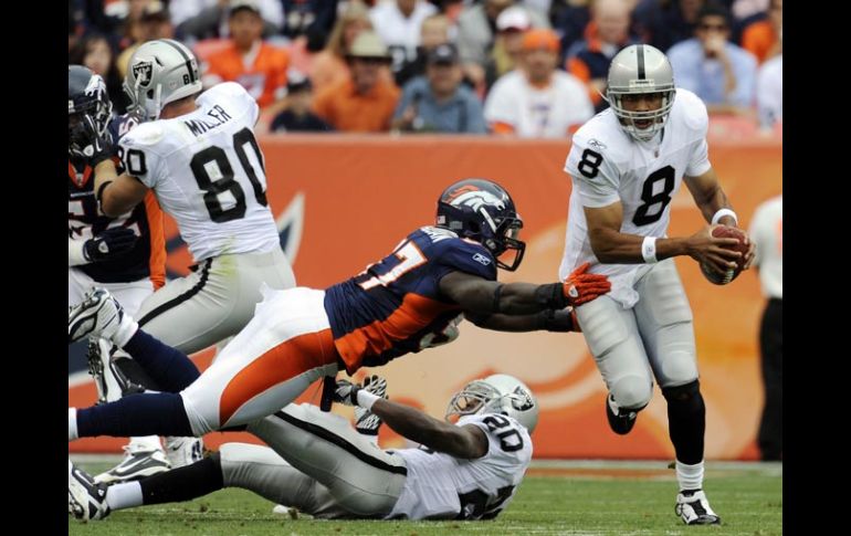 Deportes | Con marcador de 59-14 Oakland humilla a Denver en su casa Paliza de los Raiders a Broncos Con marcador de 59-14 Oakland humilla a Denver en su casa Por: AP 24 de octubre de 2010 - 18:26 hs El mariscal de campo de los Raiders Jason Campbell, (der) se escapa de Mario Haggan (iz) de Bronco. AP / DENVER, COLORADO (24/OCT/2010) - Con la ayuda de cuatro touchdowns de Darren McFadden, los Raiders de Oakland anotaron el domingo el marcador más abultado en sus 50 años de historia y apalearon por 59-14 a los desmoralizados Broncos de Denver. Los Raiders (3-4) ganaron por tercer encuentro consecutivo en el Invesco Field, aprovechando una andanada de 38 puntos en los primeros 22 minutos, incluidos touchdowns con ocho segundos de diferencia que dieron inicio a la paliza que hizo recordar a muchos los resultados disparejos que se dieron entre estos equipos de la extinta Liga Americana de Futbol (AFL por sus siglas en inglés) en la década de 1960. Los Raiders mantuvieron a los Broncos (2-5) con la duda hasta que anunciaron poco antes de la patada inicial que el sustituto Jason Campbell sería el quarterback titular -a pesar de tener una rodilla lastimada- en lugar de Bruce Gradkowski (hombro dolorido). No pareció molestarle la rodilla ni un poco, y McFadden tampoco mostró malestar por una reciente lesión en la corva al anotar con un par de carreras de cuatro yardas y una recepción de 19 yardas en la primera mitad, y una carrera de 57 yardas en la segunda. Temas NFL Futbol Americano Broncos de Denver Raiders de Oakland Lee También Así se jugarán las Semifinales del Mundial Sub-20 El Tricolor entrenó en Guadalajara tras la humillación ante Colombia México Sub-20 regresa al país tras eliminación ante Argentina Futbol hoy 12 de octubre de 2025: ¿Dónde ver los partidos en vivo? Recibe las últimas noticias en tu e-mail Todo lo que necesitas saber para comenzar tu día Registrarse implica aceptar los Términos y Condiciones