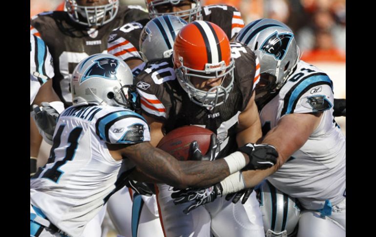 Deportes | Un gol de campo fallado le da la victoria a los Cafés por 24-23 Panteras deja ir la victoria en Cleveland Un gol de campo fallado le da la victoria a los Cafés por 24-23 Por: AP 28 de noviembre de 2010 - 16:02 hs Las panteras no han podido levantar resultados y siguen consolidados como el peor equipo de la NFL. AP / CLEVELAND, OHIO (28/NOV/2010).- El pateador John Kasay falló un gol de campo de 42 yardas en el momento en que el tiempo reglamentario expiraba y permitió que los Cafés de Cleveland se hicieran del triunfo por 24-23 sobre las Panteras de Carolina. El error de Kasay permitió al ex mariscal de campo de las Panteras, Jake Delhomme, derrotar a su anterior equipo, a pesar que fue interceptado en dos ocasiones. En duelo de equipos con marca perdedora, los Cafés (4-7) fueron dirigidos por Delhomme, quien completó 24 de 35 pases para 245 yardas, sin envíos de anotación. Para Delhomme fue su primer inicio en casa de los Cafés, después de haber sido firmado en marzo pasado, cuando fue liberado por las Panteras. El corredor Payton Hills consiguió tres anotaciones por tierra, con anotaciones de 9, 5 y 6 yardas para dirigir el ataque de los Browns. Mientras que Kasay tuvo oportunidad de darle su segundo triunfo a las Panteras (1-10) después de que el mariscal novato Jimmy Clausen dirigió una jugada que dejó el balón en posición de anotar, pero falló su patada de 42 yardas. Clausen completó 16 de 28 pases para 195 yardas con una interceptación. Temas NFL Futbol Americano Cafés de Cleveland Panteras de Carolina Recibe las últimas noticias en tu e-mail Todo lo que necesitas saber para comenzar tu día Registrarse implica aceptar los Términos y Condiciones