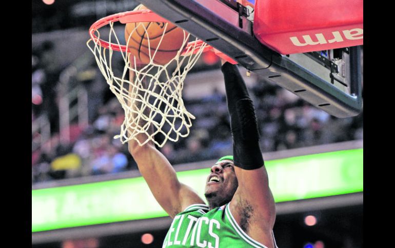 Deportes | NBA. Temporada regular Paul Pierce guía a los Celtics a su primer triunfo El alero aporta 27 puntos y ayuda a Boston a conseguir una victoria sobre los Wizards de Washington Por: AP 4 de noviembre de 2012 - 03:24 hs Hasta el fondo. El alero Paul Pierce clava la pelota en el cuarto periodo del partido contra los Wizards de Washington. AP / WASHINGTON, ESTADOS UNIDOS (04/NOV/2012).- Paul Pierce anotó el sábado 27 puntos y los Celtics de Boston vencieron por 89-86 a los Wizards de Washington para su primera victoria de la temporada. Una noche después de lo que su entrenador en jefe, Glen Rivers, calificó como un “juego soso”, los Celtics limitaron a los Wizards a una canasta en 14 tiros de campo al inicio, después apenas fueron mejores al final. La única anotación de Washington en los primeros ocho minutos se debió a una interferencia marcada en disparo de Kevin Garnett cuando la bola iba hacia la canasta, y Pierce realizó un enceste crucial desde la distancia de tres puntos para ayudar a Boston a mejorar su marca a un ganado por dos perdidos. Washington cayó a registro de 0-2 al final de su juego inaugural en casa frente a un lleno de 20 mil 308 aficionados. Ray Allen dicta sentencia en favor de Miami Ray Allen realizó una jugada de cuatro puntos cuando restaban 6.7 segundos de juego y puso adelante en el marcador de manera definitiva a Miami, Chris Bosh anotó 40 unidades, y el Heat derrotó el sábado por 119-116 a los Nuggets de Denver. LeBron James terminó con 20 puntos, 11 asistencias y nueve rebotes, mientras que Allen encestó 23 unidades para el Heat, que escapó con el triunfo cuando el disparo de tres puntos de Danilo Gallinari con dos segundos en el reloj rebotó en el aro. Dwyane Wade agregó 14 puntos para Miami (2-1). OTRAS SEDESMarcadores Sacramento 98 Indiana 106 Toronto 100 Brooklyn 107 N. Orleáns 89 Chicago 82 Portland 95 Houston 85 Utah 100 S. Antonio 110 Charlotte 99 Dallas 126 Temas NBA Basquetbol Celtics de Boston Washington Wizards Lee También Astros se instalan en la final de zona de la LNBP Astros de Jalisco doblega a Xalapa y se pone a un juego de la Final de Zona Astros de Jalisco toma ventaja sobre Xalapa en la semifinal de zona Iván Déniz confía en la fortaleza colectiva de Astros de Jalisco para Semifinales de Zona Recibe las últimas noticias en tu e-mail Todo lo que necesitas saber para comenzar tu día Registrarse implica aceptar los Términos y Condiciones