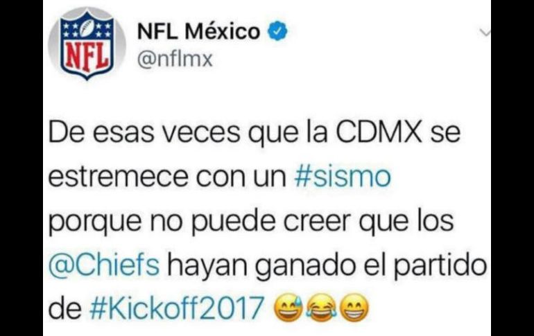 GUADALAJARA, JALISCO (08/SEP/2017).- Luego de registrarse un terremoto en México cerca de la medianoche del jueves, entidades deportivas y atletas alzaron la voz para enviar su apoyo a los afectados por el siniestro; algunos, de manera acertada, ofrecieron apoyo, sin embargo, hubo quienes por el contrario, cometieron errores que pronto los usuarios de redes sociales comenzaron a criticar.Tal es el caso de la NFL México, que ''se burló'' del movimiento telúrico registrado a las 23:49 horas tiempo del centro, pues su desafortunado tuit fue severamente criticado por quienes revisaban en Twitter utilizan la etiqueta #Sismo.''De esas veces que la CDMX se estremece con un #sismo porque no puede creer que los @Chiefs hayan ganado el partido de #Kickoff2017'', dijo la cuenta oficial de la liga en el país azteca.Ante la ola de comentarios, el mensaje fue borrado inmediatamente. Esta mañana, se pidieron disculpas a través de la plataforma social: ''NFL México se disculpa por el inaceptable tweet de ayer, que no representa los valores de la liga. Reiteramos nuestra solidaridad con México''.Otro caso por el que los usuarios replicaron fue por un tuit del equipo de futbol mexicano del Veracruz, pues en su perfil de la red social se pudo ver ''¡Escualos! ¿En dónde los agarró el temblor? RT si están bien''; este mensaje no ha sido borrado hasta el momento, ya que por muchos ha sido considerado divertido.