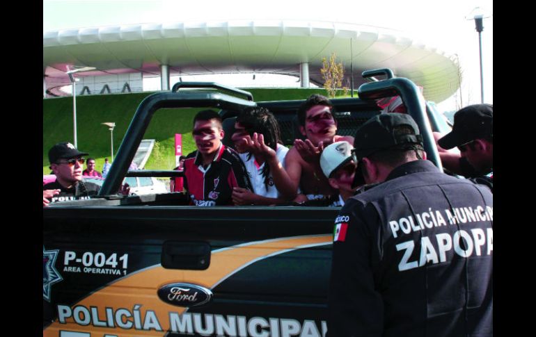 Deportes | Seguridad. Operativo en los alrededores del Estadio Policía de Zapopan arresta a nueve personas Revisiones preventivas a las porras Por: EL INFORMADOR 29 de octubre de 2012 - 04:24 hs Caen. Policía de Zapopan detienen a unos aficionados rojinegros, previo al inicio del Clásico tapatío. / ZAPOPAN, JALISCO (26/OCT/2012).- Ante los posibles desmanes por miembros de las porras del Guadalajara y del Atlas, la Dirección de Seguridad Pública de Zapopan implementó un fuerte dispositivo de seguridad en las inmediaciones del Omnilife, en el cual resultaron arrestadas nueve personas y retenido un menor de edad. Dos horas antes que iniciara el Clásico tapatío, los porristas de ambos equipos que iban llegando fueron sometidos a una revisión preventiva, con el fin de localizar alguna navaja, tubo, piedra o porciones de drogas. Por su parte, más de 800 policías municipales y de seguridad privada mantuvieron el operativo de seguridad alrededor del estadio, sin que se hubiera registrado alguna pelea entre los aficionados de ambos equipos de la Zona Metropolitana de Guadalajara. Al final del Clásico tapatío, se informó que nueve hombres fueron detenidos; siete por faltas administrativas, uno por daños y otro por lesiones, además de la retención de un menor de edad por disturbios. TWITTER. OPINAN USUARIOS También juegan en las redes En las redes sociales también se jugó el Chivas vs. Atlas. Bajo la etiqueta #Clásicotapatío los usuarios de Twitter compartieron desde antes de la primera patada al balón. Por ejemplo, el senador panista Javier Lozano Alarcón (@JLozanoA) dio cuenta de los partidos que se esperaba para el domingo: “A las 12:00 Pumas vs. América y Puebla vs. Atlante. A las 5:00 pm es Chivas vs. Atlas. Esto en fútbol mexicano. Voy Pumas, Puebla y Chivas”. Por su parte el clavadista tapatío Iván García dejó muy en claro su afición por el cuadro rojiblanco. “Muy buenos días a todos, que bonito es estar en Guadalajara después de una gran aventura, y recuerden que hoy ganan las súper CHIVAS”. Los usuarios celebraron los goles de Márquez Lugo y Marco Fabián. Shavi (@diegoG40) escribió: “Rafa Márquez y Marco Fabián los grandes de Chivas metiendo los goles al Atlas”. Mientras tanto los zorros esperaban que la tarde fuera de ellos. Roberto Vázquez (@Mojinegro) dijo: “Venga Atlas, a dar la voltereta”. El complemento fue marcado por las pocas llegadas a gol y la expulsión de Hugo Rodríguez. Los tuiteros prefirieron los primeros 45 minutos que el resto del juego. “Pues no sé, yo me quedo con el primer tiempo del #Clásicotapatío” y “ABURRIDÍSIMO segundo tiempo” de @djimboCarrasco. Temas Clásico Tapatío Estadio Chivas Lee También ¿Erick Gutiérrez y Roberto Alvarado regresan a la actividad ante Mazatlán? Frangie reforzará medidas tras fallas viales en el Estadio AKRON Guadalajara y el Mar México muestra mejoría, pero no le alcanza ante Ecuador Recibe las últimas noticias en tu e-mail Todo lo que necesitas saber para comenzar tu día Registrarse implica aceptar los Términos y Condiciones