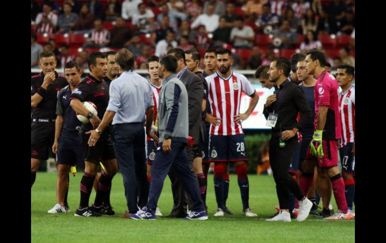 GUADALAJARA, JALISCO (19/JUL/2017).- No pudo haber peor final para el Chivas vs Porto de este miércoles, pues luego de que el Guadalajara empatara a dos en tiempo regular y obligara a irse a la ronda de penales para definir al campeón de la Súper Copa Tecate, la escuadra portuguesa abandonó la cancha y dejó inconcluso el compromiso. Apenas se silbó el final de la parte complementaria, el estratega del Porto, Sergio Conceicao, se reunió con el cuerpo arbitral y Matías Almeyda y entre alegatos mandó a su equipo al vestidor, desatando así el descontento entre los presentes. Ya sin los dragones sobre el césped, los jugadores de Chivas aplaudieron a los más de 20 mil aficionados que se dieron cita en el inmueble y después también partieron con rumbo hacia los vestidores del coloso. El sonido local había anunciado que tras el empate a dos todo se definiría desde los once pasos, sin embargo el marcador quedó igualado tras la decisión de los portugueses. No hubo premiación alguna en el inmueble rojiblanco. EL INFORMADOR / DIEGO REOS