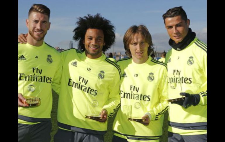 Deportes | Posaron con los cuatro trofeos otrogados el día de ayer lunes en Zurich Real Madrid felicita a sus miembros del 11 Mundial Posaron con los cuatro trofeos otrogados el día de ayer lunes en Zurich Por: NTX 12 de enero de 2016 - 11:46 hs MADRID, ESPAÑA (12/ENE/2016).- Los jugadores y el cuerpo técnico del equipo de futbol Real Madrid posaron antes del entrenamiento de este martes, con los cuatro trofeos del Once Mundial de la FIFA 2015. La plantilla felicitó al portugués Cristiano Ronaldo, el croata Luka Modric, el español Sergio Ramos y el brasileño Marcelo Viera por su inclusión en el Once Mundial de la Federación Internacional de Futbol Asociación (FIFA), publicó el conjunto "blanco" en su sitio oficial. Señaló que los jugadores, el cuerpo técnico y el resto de empleados que trabaja con el primer equipo en la Ciudad Real Madrid posaron junto a los trofeos, minutos antes de que comenzara el entrenamiento previo al encuentro de la Liga Española ante el Sporting, que se disputará este domingo en el estadio Santiago Bernabéu. Cistiano Ronaldo, Marcelo, Sergio Ramos y Modric fueron seleccionados dentro del Once Mundial que se dio a conocer durante la gala del Balón de Oro celebrada este lunes en Zúrich, Suiza. Cristiano, que ocupa una de las tres posiciones de delantero, repite por novena vez consecutiva desde 2007 en el Once Mundial. Sergio Ramos fue premiado por sexta vez, tras las de 2008, 2011, 2012, 2013 y 2014. Marcelo aparece en este equipo ideal por segunda ocasión, mientras que Modric se estrena en el galardón. El Once Mundial está compuesto por Manuel Neuer, Dani Alves, Thiago Silva, Sergio Ramos, Marcelo Viera, Andrés Iniesta, Luka Modric, Paul Pogba, Neymar Jr., Lionel Messi y Cristiano Ronaldo. Temas Balón de Oro Futbol Español Futbol Internacional Real Madrid Lee También México busca frenar el paso perfecto de Argentina en Mundial Sub-20 Lista actualizada de selecciones que ya clasificaron al Mundial 2026 Mundial 2026 traerá derrama millonaria al país ¿Dónde ver EN VIVO el partido amistoso México vs Colombia? Recibe las últimas noticias en tu e-mail Todo lo que necesitas saber para comenzar tu día Registrarse implica aceptar los Términos y Condiciones