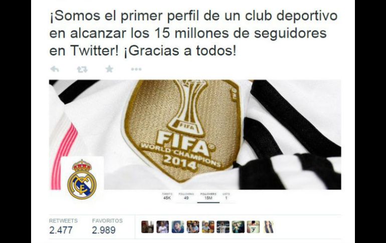 Deportes | El club de futbol supera las cuentas del Barcelona, Manchester United, Milan y Bayern Real Madrid, primer club con 15 millones de seguidores en Twitter El club de futbol supera a las cuentas del Barcelona, Manchester United, Milan y Bayern Munich Por: SUN 3 de marzo de 2015 - 15:07 hs El club publicó en redes sociales un mensaje de agradecimiento a sus seguidores. TWITTER / @realmadrid CIUDAD DE MÉXICO (03/MAR/2015).- Las redes sociales se han convertido en un nuevo campo de juego. El club de futbol Real Madrid anunció que ha llegado a los 15 millones de seguidores en Twitter, cifra que según la entidad blanca lo coloca como el primer club deportivo en alcanzar dicha cifra. "¡Somos el primer perfil de un club deportivo en alcanzar los 15 millones de seguidores en Twitter! ¡Gracias a todos!", informó desde su cuenta @realmadrid. De este modo, Real Madrid supera las cuentas oficiales en Twitter del Barcelona (14.3 millones), Manchester United (4.53), AC Milan (2.43), Bayern Múnich (1.92). Inlcuso, el Madrid se impone en seguidores a las cuentas de conjuntos de otros deportes: Yankees de Nueva York en la MLB (1.33), Patriotas de Nueva Inglaterra de la NFL(1.28) y al Miami Heat de la NBA (2.94). Temas Futbol Internacional Real Madrid Twitter Redes Sociales Lee También El Oviedo recibe a los periquitos Futbol hoy 17 de octubre de 2025: ¿Dónde ver los partidos en vivo? Daniel Carrera presenta “La infalible” en el FICM ¿Erick Gutiérrez y Roberto Alvarado regresan a la actividad ante Mazatlán? Recibe las últimas noticias en tu e-mail Todo lo que necesitas saber para comenzar tu día Registrarse implica aceptar los Términos y Condiciones