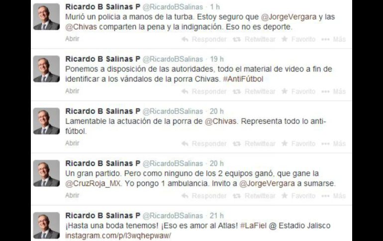 Deportes | El secretario de Seguridad de Guadalajara le responde para señalar su error Ricardo Salinas difunde falsa muerte de policía El secretario de Seguridad de Guadalajara le responde para señalar su error Por: EL INFORMADOR 23 de marzo de 2014 - 18:00 hs Aspecto de los mensajes difundidos por Salinas Pliego. ESPECIAL / GUADALAJARA, JALISCO (23/MAR/2014).- Ricardo Salinas Pliego, dueño del Club Atlas y TV Azteca, informó vía su cuenta de Twitter que un policía había fallecido tras la trifulca que se desató en el clásico tapatío. Mediante su cuenta de Twitter @RicardoBSalinas dijo "Murió un policia a manos de la turba. Estoy seguro que @JorgeVergara y las @Chivas comparten la pena y la indignación. Eso no es deporte". Carlos Mercado Casillas, secretario de Seguridad de Guadalajara, respondió también mediante la red social al empresario, para señalar que ningún uniformado había muerto. "@RicardoBSalinas afortunadamente por los hechos del domingo no murió ningún policía de Guadalajara, en este momento hay cinco hospitalizados. EL INFORMADOR consultó al Servicio Médico Forense y a la Fiscalía General de Jalisco, instancias que negaron el fallecimiento. Casi dos horas más tarde, Salinas Pliego corrigió la información difundida previamente en otro tuit donde dice "Me informan, afortunadamente, que la noticia del fallecimiento no es correcta. No dejemos que esta violencia quede impune". Durante el clásico tapatío del sábado, barristas del club Chivas se enfrentaron a uniformados. Los hechos violentos derivaron en la clausura del Estadio Jalisco. De los 21 policías heridos sólo quedan cinco hospitalizados. Ninguno grave. Cinco están en Centro Médico de Occidente y en la Clínica 45, informó poco antes del Ayuntamiento tapatío en rueda de prensa. Temas Chivas Atlas Futbol Mexicano Clásico Tapatío Ricardo Salinas Pliego Lee También Futbol hoy 13 de octubre de 2025: ¿Dónde ver los partidos en vivo? Rafael Márquez elogia la Academia AGA Así se jugarán las Semifinales del Mundial Sub-20 El Tricolor entrenó en Guadalajara tras la humillación ante Colombia Recibe las últimas noticias en tu e-mail Todo lo que necesitas saber para comenzar tu día Registrarse implica aceptar los Términos y Condiciones