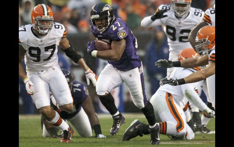 Deportes | Baltimore gana sin problemas a Cleveland 24-10 Rice corre 204 yardas en triunfo de Cuervos Baltimore gana sin problemas a Cleveland 24-10 Por: AP 4 de diciembre de 2011 - 19:12 hs Ray Rice corrio 204 yardas en el partido ante Cleveland. REUTERS / CLEVELAND, OHIO (04/DIC/2011).- Ray Rice corrió el domingo para 204 yardas por primera vez en su trayectoria, incluyendo un acarreo de 67 yardas en el tercer cuarto, y los Cuervos de Baltimore vencieron 24-10 a los Cafés de Cleveland. Los Cuervos siguen compartiendo con Pittsburgh el liderato de la División Norte en la Conferencia Americana. Rice y Ricky Williams tuvieron cortas carreras de touchdown y Lardarius Webb regresó una patada 68 yardas para anotar por los Cuervos (9-3), que hicieron de las suyas con los Cafés (4-8). Baltimore avanzó 290 yardas por tierra. Los Cuervos volvieron a apostar a Rice en un día de lluvia y viento, cuando Joe Flacco tuvo problemas en los pases y el pateador Billy Cundiff falló dos intentos de gol de campo. Cleveland perdió por quinta ocasión en seis encuentros y los Cafés tienen sólo tres días para alistarse y enfrentar a los Acereros. Cuando los Cuervos ganaban 10-3 en el tercer período, Rice se escapó en su carrera de 67 yardas. Temas NFL Futbol Americano Cuervos de Baltimore Cafés de Cleveland Recibe las últimas noticias en tu e-mail Todo lo que necesitas saber para comenzar tu día Registrarse implica aceptar los Términos y Condiciones