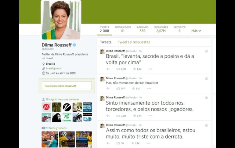 Deportes | La Presidenta de Brasil lamenta inmensamente la derrota por aficionados y jugadores Rousseff, 'muy triste' por la derrota La Presidenta de Brasil lamenta inmensamente la derrota por los aficionados y los jugadores Por: AFP 8 de julio de 2014 - 17:53 hs La Mandataria dijo sentirse 'muy muy triste con la derrota' en su cuenta de Twitter. ESPECIAL / BRASILIA, BRASIL (08/JUL/2014).- La Presidenta brasileña, Dilma Rousseff, se declaró este martes "muy muy triste" con la dramática derrota de Brasil ante Alemania ( 1-7) en semifinales de la Copa del Mundo, pero animó a los brasileños a levantarse, sacudirse el polvo y salir adelante. "Al igual que todos los brasileños, estoy muy muy triste con la derrota", dijo la Mandataria en su cuenta de Twitter, poco después del final del partido. "Lo siento inmensamente por todos nosotros hinchas, y por nuestros jugadores", lamentó. "Pero no nos vamos a dejar abatir", añadió, y citó la canción 'Volta por cima', del brasileño Paulo Vanzolini, para pedir: "Brasil, levanta, sacúdete el polvo y sal adelante". La Presidenta defendió en las últimas semanas el éxito de una Copa que ha dado fenomenales e intensos partidos. Escenas de incredulidad, llanto y rabia sacudieron al país anfitrión de la Copa el martes, tras encajar la peor derrota jamás sufrida por su selección, que había pasado a semifinales y soñaba con la final. Temas Futbol Internacional Selección de Brasil Selección de Alemania Mundial Brasil 2014 Dilma Rousseff Lee También Futbol hoy 11 de octubre de 2025: ¿Dónde ver los partidos en vivo? Mbappé brilla en su regreso a París México vs Argentina: Estas son las posibles alineaciones para el Mundial Sub-20 Dólar sube ante tensiones comerciales y preocupaciones fiscales Recibe las últimas noticias en tu e-mail Todo lo que necesitas saber para comenzar tu día Registrarse implica aceptar los Términos y Condiciones